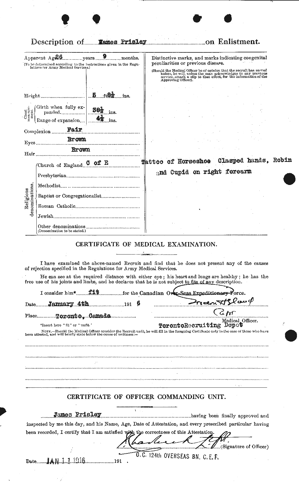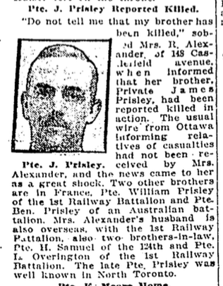 “Don’t tell me my brother has been killed,” sobbed Mrs. Alexander of 148 Castlefield avenue, when informed that her brother, Private James Prisley, had been reported killed in action. The usual wire from Ottawa informing relatives of casualties had not been received by Mrs. Alexander, and the news came to her as a great shock. Two other brothers are in France. Pte. William Prisley of the 1st Railway Battalion and Pte. Ben. Prisley of an Australian Battalion, also two brothers-in-law, Pte. H. Samuel of the 124th and Pte I. Overington of the 1st Railway Battalion. The late Pte. Prisley was well known in North Toronto.