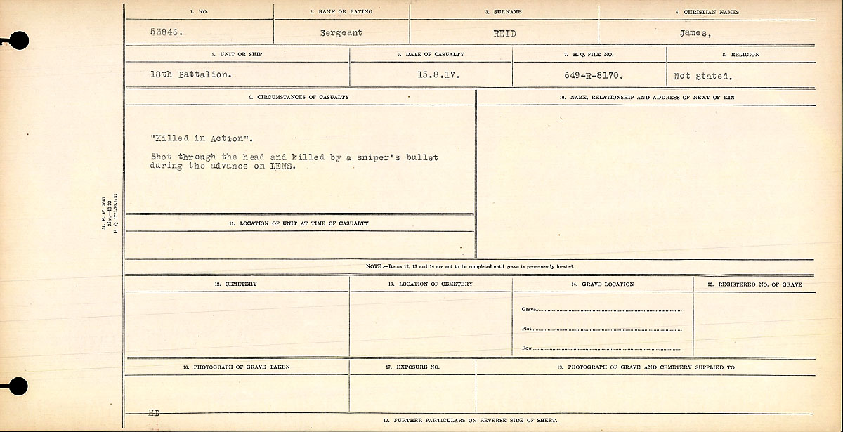 “Killed in Action” Shot through the head and killed by a sniper’s bullet during the advance on LENS.