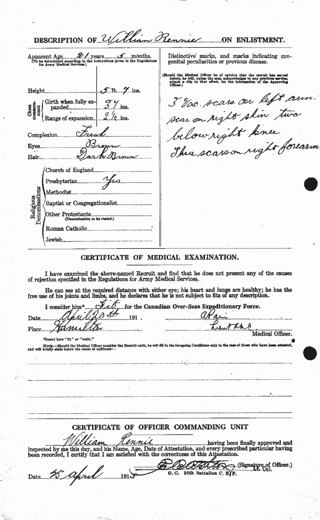 Family Search: When Sergeant William Milne Rennie was born on 15 December 1893, in Aberdeen, Aberdeenshire, Scotland, United Kingdom, his father, Alexander Rennie, was 28 and his mother, Wilhelmina Jane Cheyne Johnston, was 26. He immigrated to Canada in 1913 and lived in Old Aberdeen, Aberdeen, Aberdeenshire, Scotland, United Kingdom in 1901. He registered for military service in 1915. In 1915, at the age of 22, his occupation is listed as labourer in Hamilton, Wentworth, Ontario, Canada. He died on 3 March 1919, in Wimereux, Pas-de-Calais, France, at the age of 25, and was buried in Wimille, Pas-de-Calais, France.
