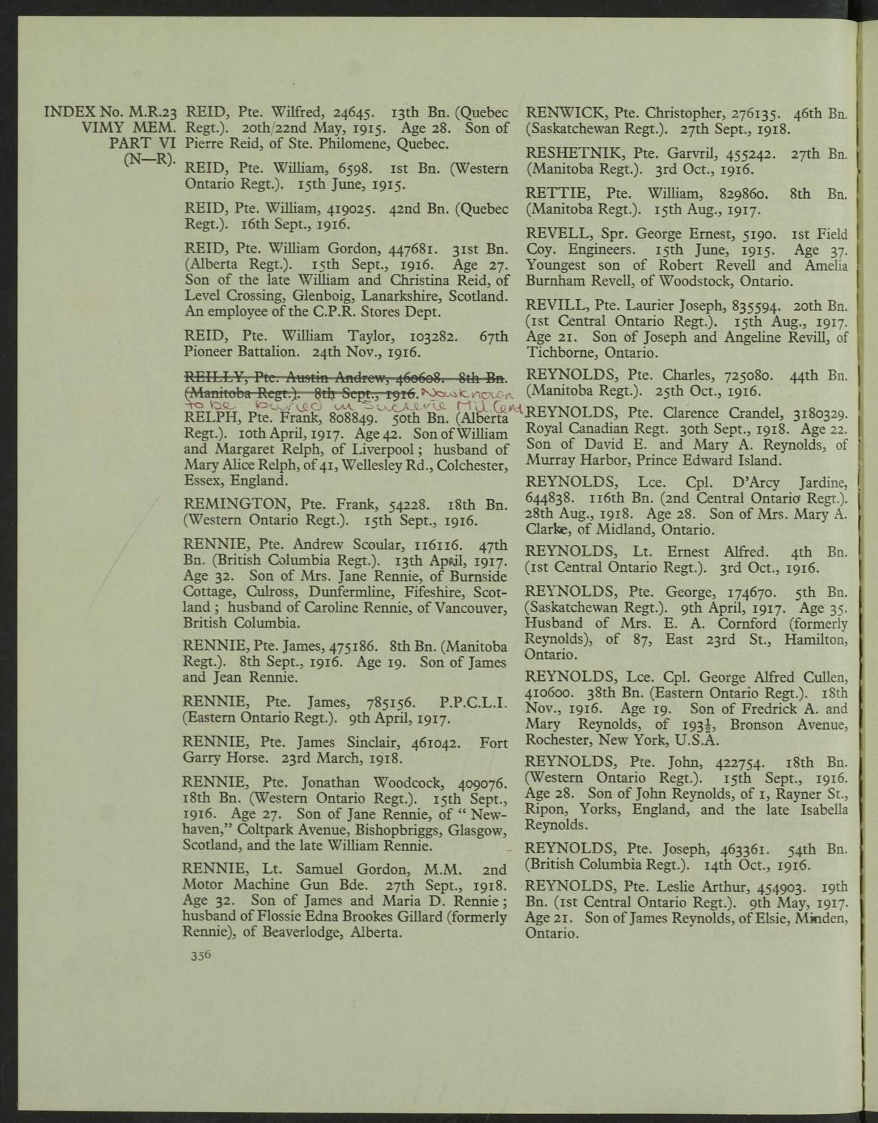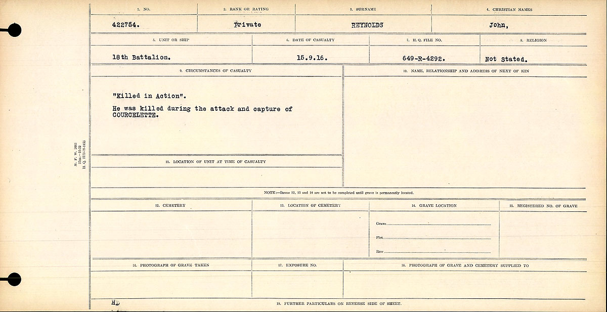 Reynolds, John: Service no. 422754 CVWM Page Digitized Service Record Source: September 1916 casualty. Find-A-Grave “Killed in Action” He was killed during the attack and capture of Courcelette. Pte. Reynolds name inscribed on the Vimy Memorial. Source: CVWM Share this: Click to email a link to a friend (Opens in new window) Email Click to share on Facebook (Opens in new window) Facebook Click to share on X (Opens in new window) X Click to share on Reddit (Opens in new window) Reddit Click to share on LinkedIn (Opens in new window) LinkedIn Click to print (Opens in new window) Print Click to share on Tumblr (Opens in new window) Tumblr Click to share on Pocket (Opens in new window) Pocket Click to share on Pinterest (Opens in new window) Pinterest Click to share on Telegram (Opens in new window) Telegram Click to share on WhatsApp (Opens in new window) WhatsApp Like Loading...