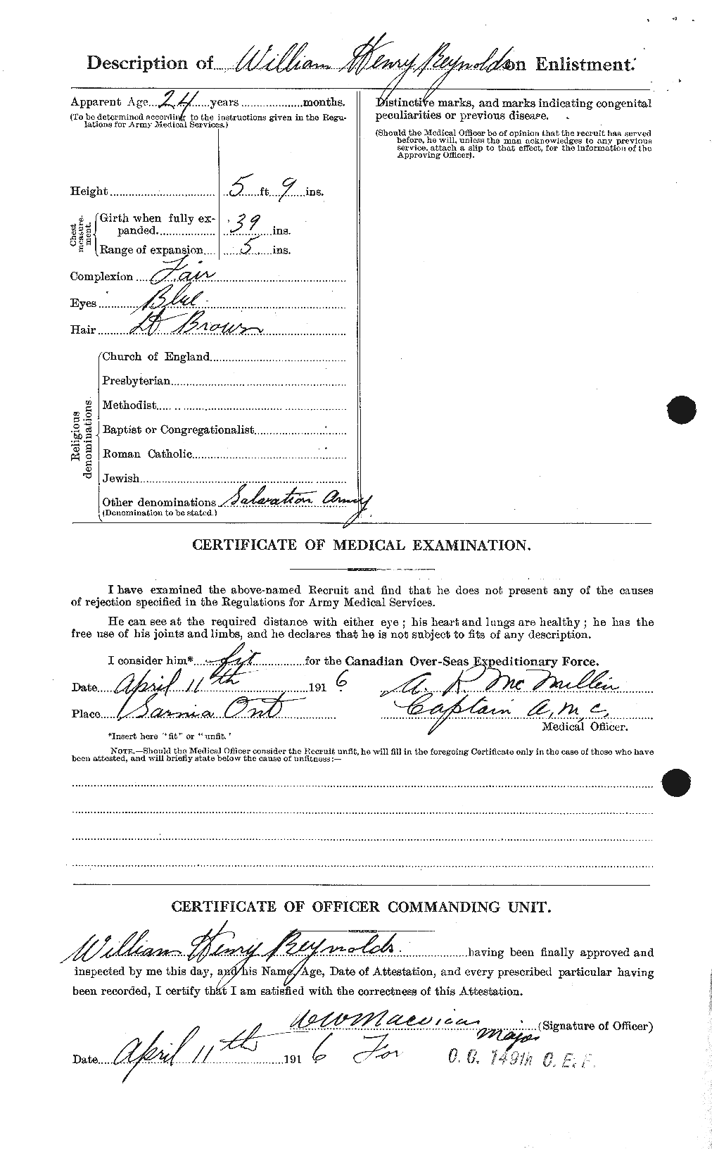 Attested to the 149th Battalion. With two attestation numbers: 845188 and 845197. Note that burial records are under service number 845197. He was discharged from service at Camp Borden and appears to have re-enlisted.