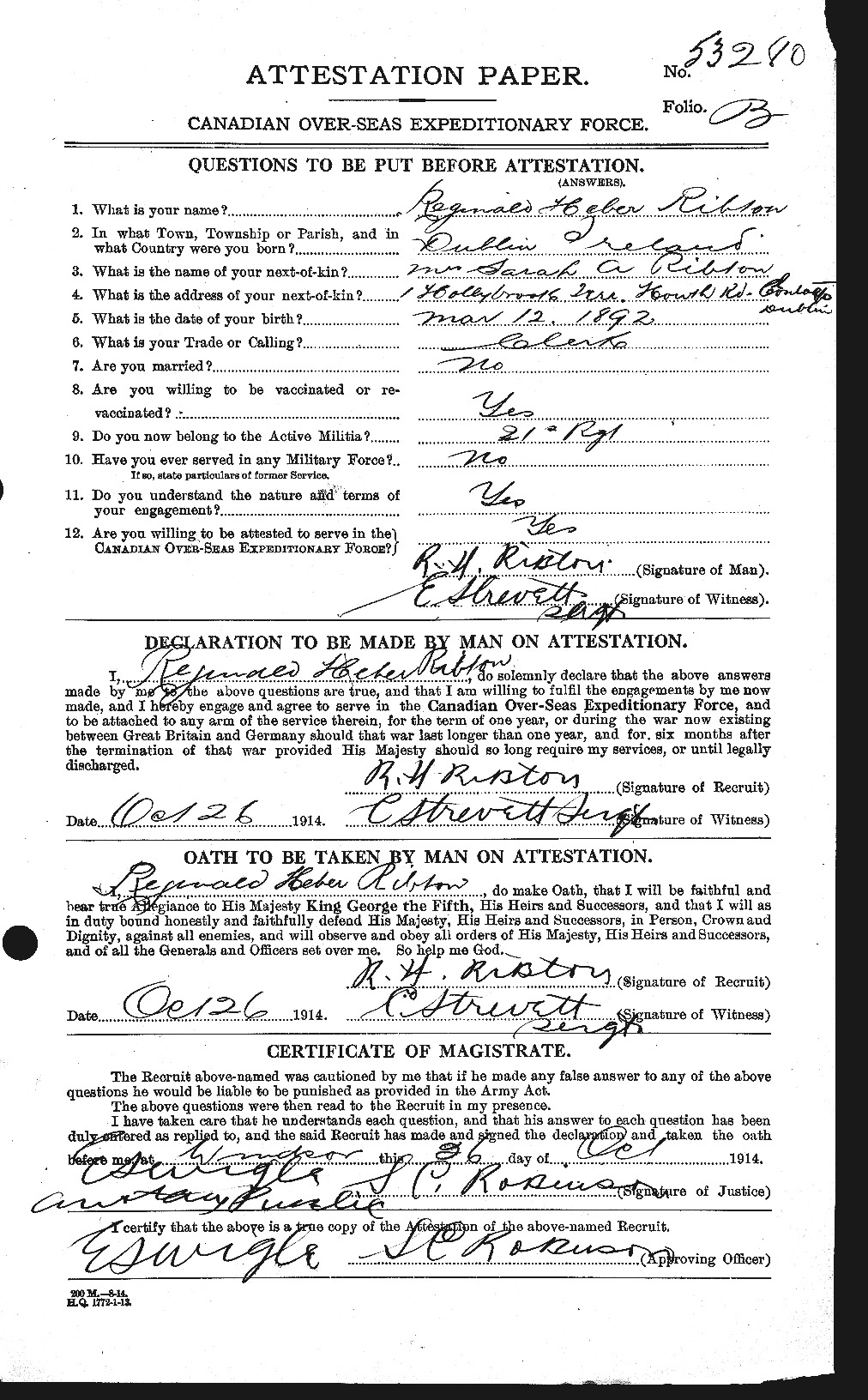 Family Search: When Lance-Corporal Reginald Heber Ribton was born on 12 March 1892, in Dublin, County Dublin, Ireland, his father, Reginald Ribton, was 35 and his mother, Sarah Ribton, was 30. He immigrated to Canada in 1913 and lived in Fairview, Clondalkin, County Dublin, Ireland in 1911 and Windsor, Sandwich, Essex, Ontario, Canada in 1914. He registered for military service in 1914. In 1914, at the age of 22, his occupation is listed as bank clerk, merchant’s bank in Windsor, Sandwich, Essex, Ontario, Canada. He died on 9 July 1917, in Villers-au-Bois, Pas-de-Calais, France, at the age of 25, and was buried in Villers-au-Bois, Pas-de-Calais, France.