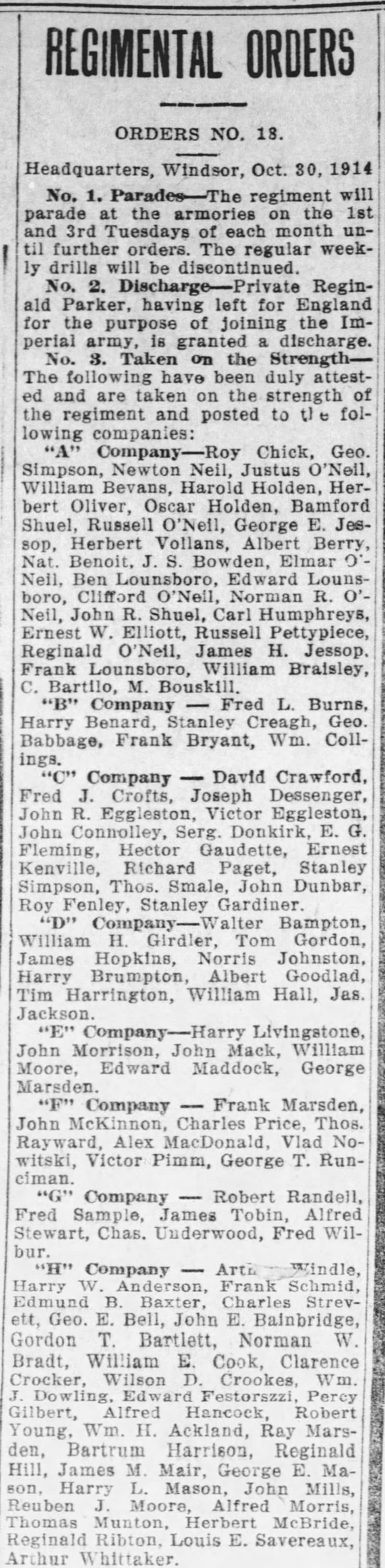 This soldier enlisted with the 18th Battalion (reg. no. 53280) at Windsor, Ontario on October 26, 1914. He was a bank clerk working for The Merchants Bank of Canada. The 18th Battalion travelled to England, trained, and began active service in September 1915.