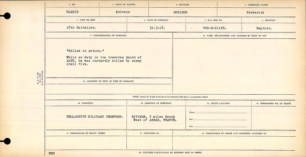 Family Search: When Private Frederick Burton Robison was born on 5 November 1891, in London Township, Middlesex, Ontario, Canada, his father, Thomas Robison, was 40 and his mother, Ellen McKeen, was 29. He married Ella Lillian White on 20 July 1915, in London Township, Middlesex, Ontario, Canada. He lived in Middlesex, Ontario, Canada in 1901 and London, Ontario, Canada in 1916. He registered for military service in 1916. In 1916, at the age of 25, his occupation is listed as carpenter in London, Ontario, Canada. He died on 31 March 1918, in Agny, Pas-de-Calais, Nord-Pas-de-Calais, France, at the age of 26, and was buried in Bellacourt Military Cemetery, Rivière, Pas-de-Calais, Nord-Pas-de-Calais, France.