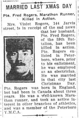 Pte. Frederick J. Rogers fell in action on October 3, 1916. Such was the sad news which reached his wife at 144 Jarvis street on Saturday. He enlisted in Peterboro [Peterborough, Ontario] in June, 1915, with the 59th Battalion, going overseas from Brockville in March of this year. From England he was transferred to another battalion at the front. Pte. Rogers was born in England 26 years ago, and had been in Canada about three years. He was working as an electrician in Peterboro when he enlisted. He was a well-known long-distance runner and Y.M.C.A. man in Peterboro, Toronto and Kingston. On last Christmas Day he was married at Brockville to Violet Gallett, who survives him. Mrs. Rogers had five brothers at the fron, one with the Canadians and four with the British Army.