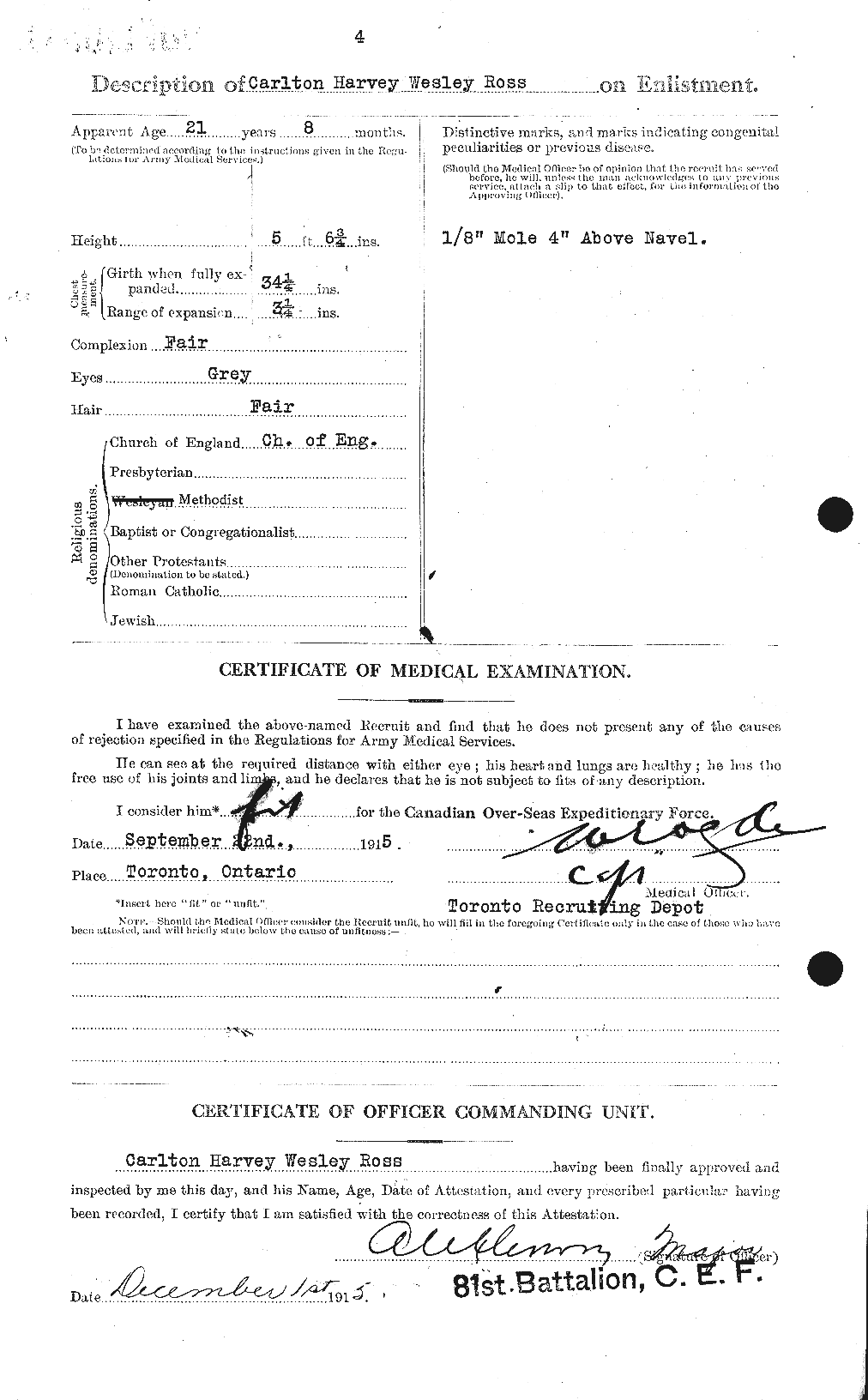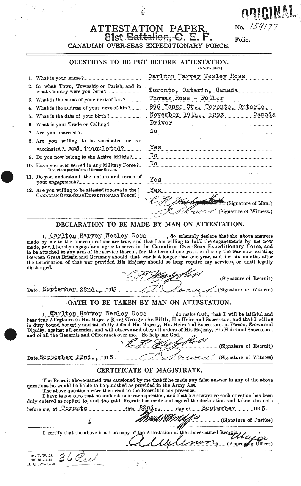 The gunshot wound in the head of Sergt. C.H.W. Ross has proved fatal. He is this morning officially reported to have died a t the No. 30 Casualty Clearing Stations. Sergt. Ross is the son Mr. and Mrs. Thomas Ross of 895 Yonge street. He was 23 years of age and was born in Toronto. He went overseas in April last, and was reported wounded on March 5. Previous to enlisting he was employed by the Hyslop Automobile Co. He was a member of the Orange Young Britons’ Society and of the St. Paul’s Anglican Church.