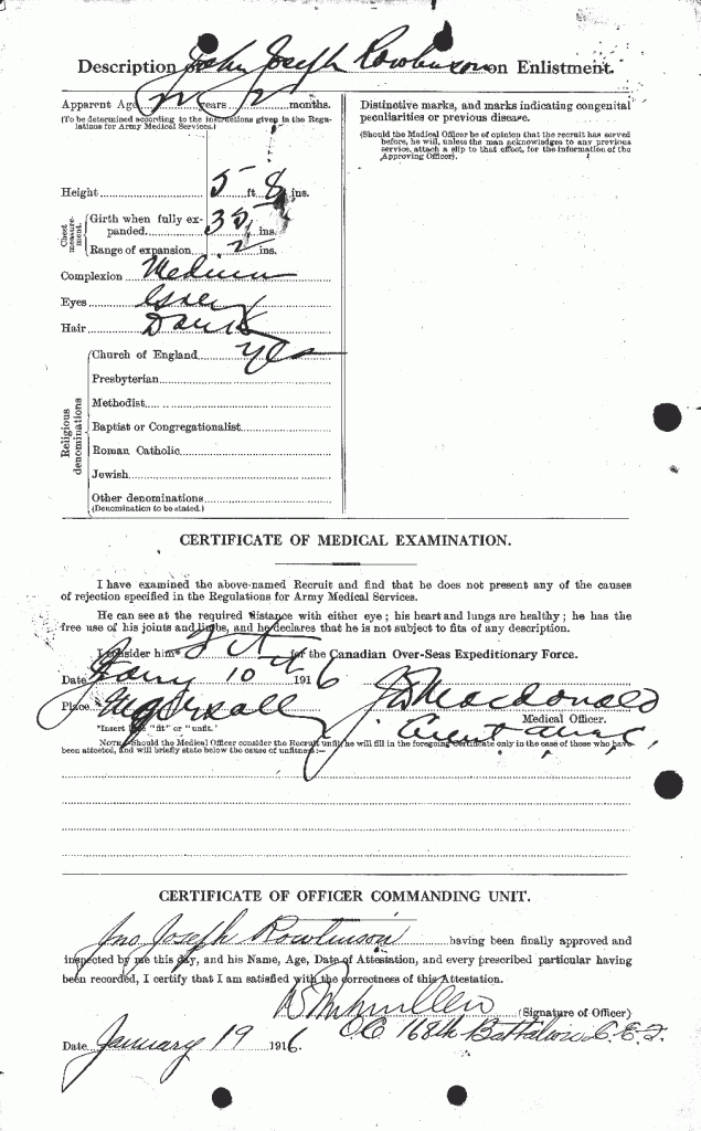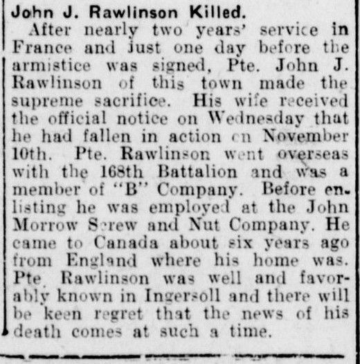 Family Search: When Private John Joseph Rowlinson was born on 2 November 1893, in Newton, Cheshire, England, United Kingdom, his father, Joseph Rowlinson, was 20 and his mother, Marth Ann Hall, was 20. He married Lilley May Demaray on 7 April 1916, in Ingersoll, Oxford, Ontario, Canada. He immigrated to Canada in 1913 and lived in Ingersoll, Oxford, Ontario, Canada in 1916. He registered for military service in 1916. In 1916, at the age of 23, his occupation is listed as shoemaker in Ingersoll, Oxford, Ontario, Canada. He died on 10 November 1918, in Ciply, Mons, Hainaut, Belgium, at the age of 25, and was buried in Mons, Hainaut, Belgium.