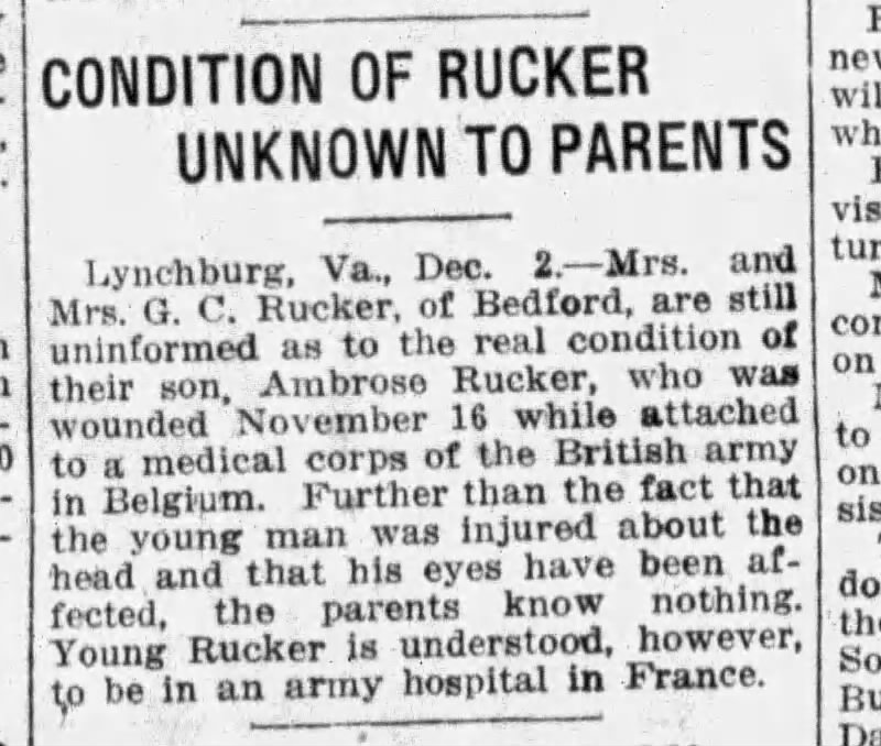 Private Rucker was BENJAMIN Rucker of Bedford County, Virginia, USA. He embellished his information on his attestation papers – changing his name and birth location and providing a fanciful occupation – “orange picker.” Ben’s father was an attorney in Bedford County, VA, and Ben appears there with the family in both the 1900 and 1910 US censuses. In 1910, he is one of seven children, all born in Virginia. He was certainly in school although this is not indicated on the census.