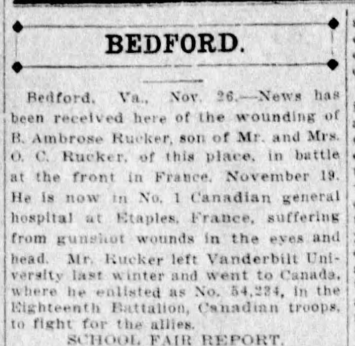 Private Rucker was BENJAMIN Rucker of Bedford County, Virginia, USA. He embellished his information on his attestation papers – changing his name and birth location and providing a fanciful occupation – “orange picker.” Ben’s father was an attorney in Bedford County, VA, and Ben appears there with the family in both the 1900 and 1910 US censuses. In 1910, he is one of seven children, all born in Virginia. He was certainly in school although this is not indicated on the census.