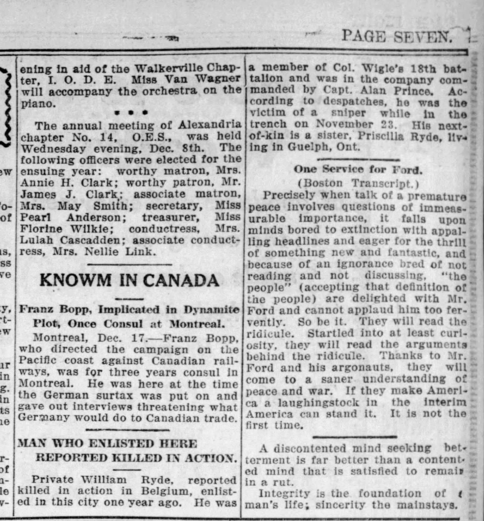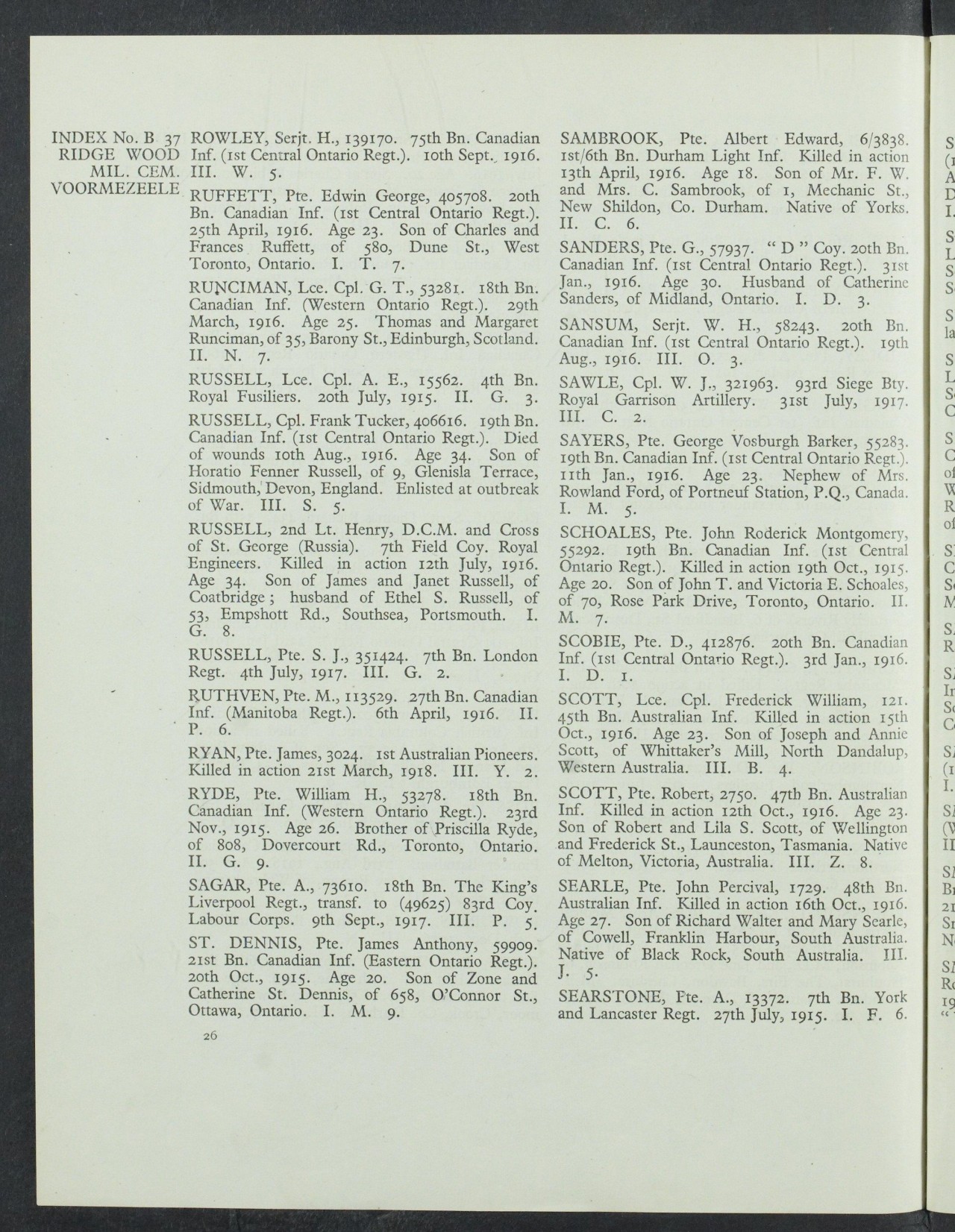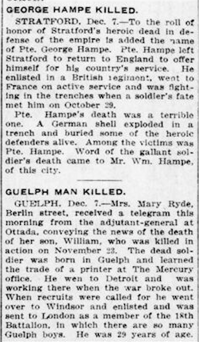 Family Search: When Private William Henry Ryde was born on 28 May 1890, in Guelph, Wellington, Ontario, Canada, his father, Urban Ryde, was 33 and his mother, Mary Fyfe, was 34. He immigrated to Detroit, Wayne, Michigan, United States in 1914. He registered for military service in 1914. In 1914, at the age of 24, his occupation is listed as printer in Detroit, Wayne, Michigan, United States. He died on 23 November 1915, in Ieper, West Flanders, Belgium, at the age of 25, and was buried in Ieper, West Flanders, Belgium.
