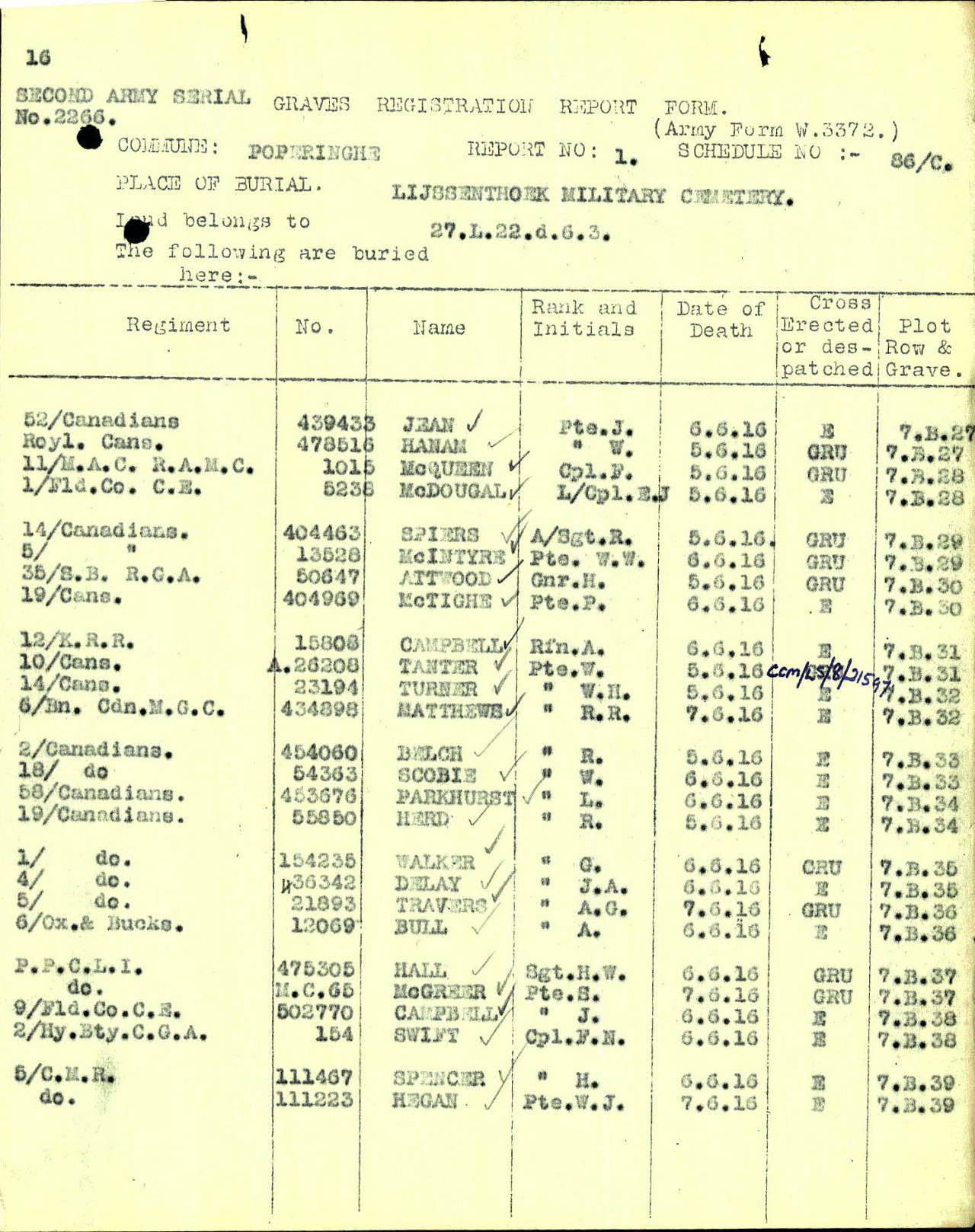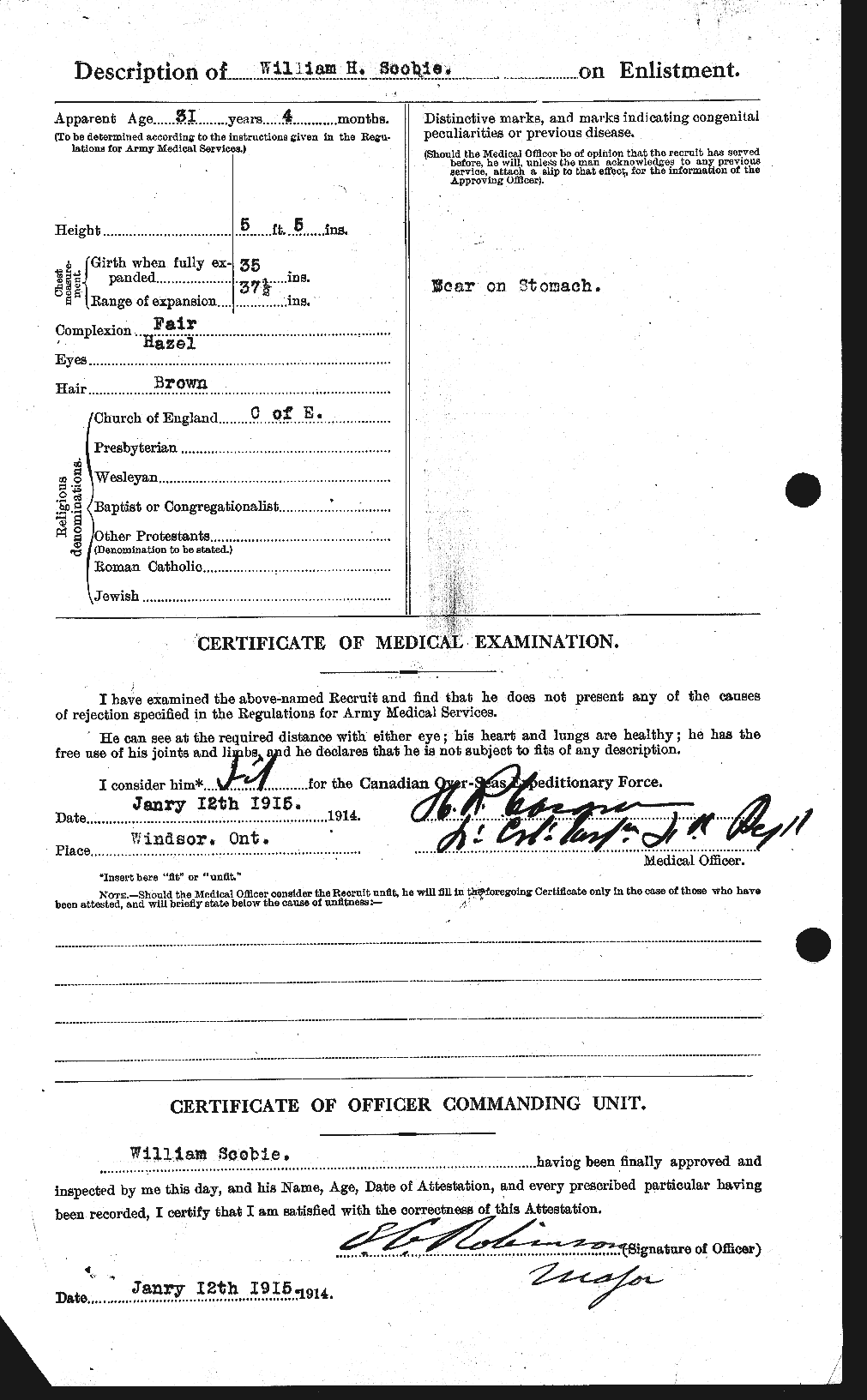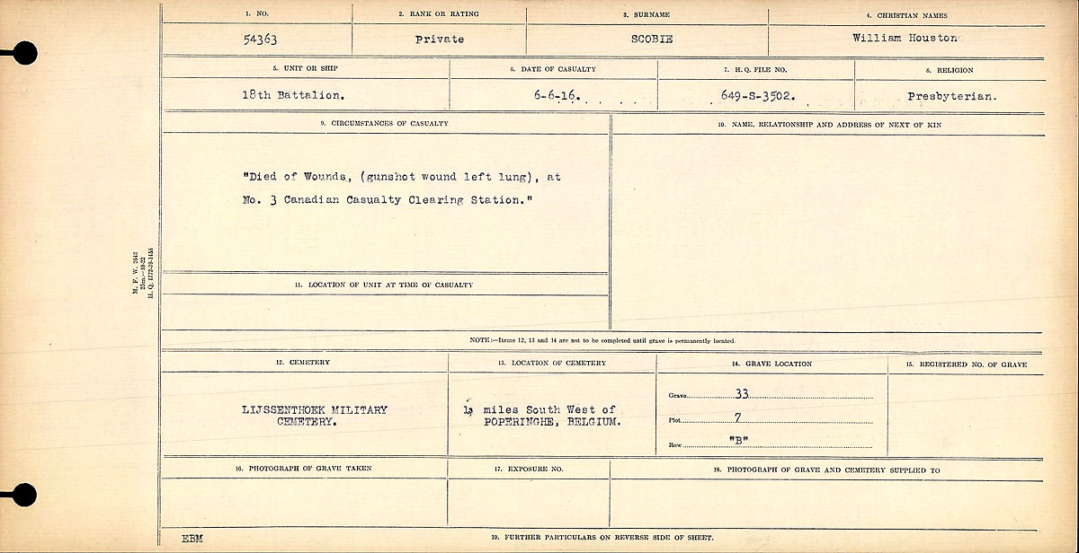 Family Search: When Private William Houston Scobie was born on 21 October 1883, in Kilbirnie, Ayrshire, Scotland, United Kingdom, his father, Robert Scobbie, was 35 and his mother, Janet Houston, was 31. He immigrated to Chicago, Cook, Illinois, United States in 1913 and lived in Kilbarchan, Renfrewshire, Scotland, United Kingdom for about 20 years. He registered for military service in 1915. In 1915, at the age of 32, his occupation is listed as plumber. He died on 6 June 1916, in Poperinge, West Flanders, Belgium, at the age of 32.