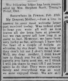 | March 21, 1917 | Letter Published | Letter from Private Scott to his mother, Mrs. Stephen Scott, published in the Peterborough Examiner. |