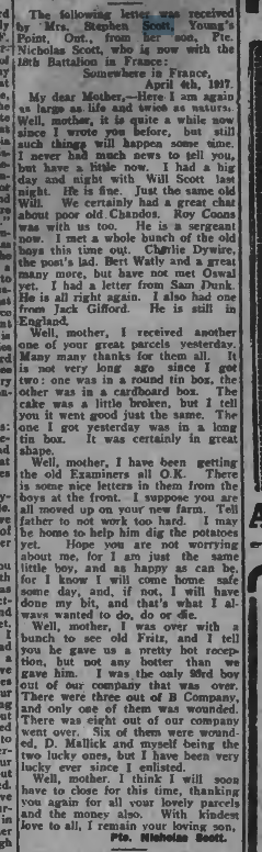 | June 2, 1917. | Letter Published | The last letter known to Private Scott to his sister, Miss Mary Scott, is published in the Peterborough Examiner. |