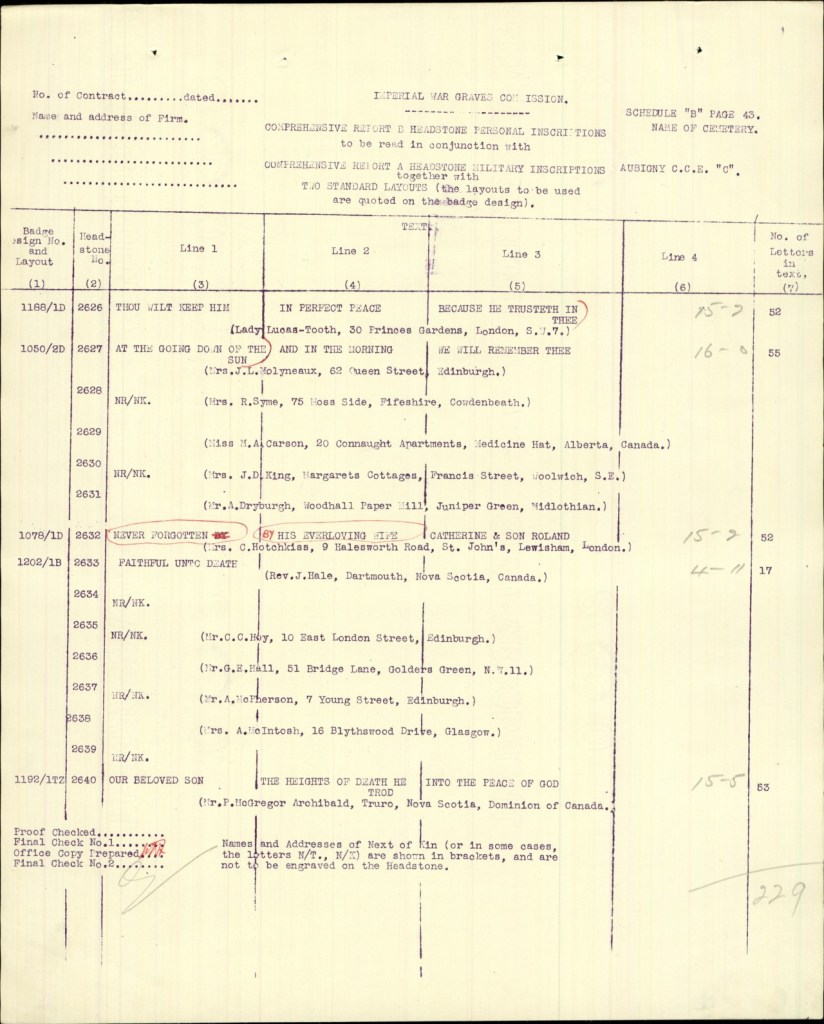 Family Search: When Harold Leo Scully was born on 10 May 1894, in Owen Sound, Grey, Ontario, Canada, his father, Michael Scully, was 48 and his mother, Catherine Bolster, was 44. He lived in Grey, Ontario, Canada for about 10 years. He registered for military service in 1916. In 1916, at the age of 22, his occupation is listed as purchasing agent. He died on 7 June 1918, in France, at the age of 24, and was buried in Aubigny Communal Cemetery Extension, Aubigny, Pas-de-Calais, Nord-Pas-de-Calais, France.