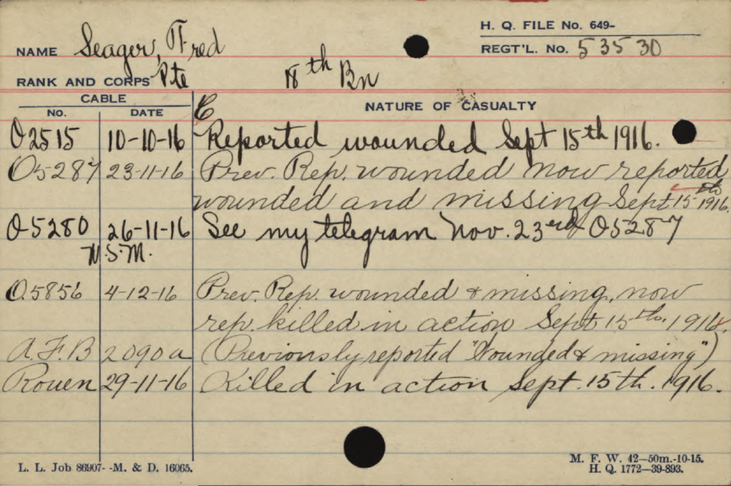 Family Search: Private Frederick Seager was born on 10 September 1884, in Norwich, Norfolk, England, United Kingdom as the son of Sarah Seager. He married Ethel Emma Seager in 1910, in Norwich, Norfolk, England, United Kingdom. They were the parents of at least 1 daughter. He immigrated to Canada in 1913. He registered for military service in 1914. In 1914, at the age of 30, his occupation is listed as baker in Point Edward, Lambton, Ontario, Canada. He died on 15 September 1916, in Courcelette, Somme, Picardie, France, at the age of 32, and was buried in Vimy, Pas-de-Calais, Nord-Pas-de-Calais, France.