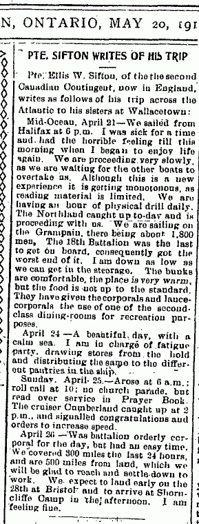 Pte. Ellis W. Sifton of the second Canadian Contingent, how in England, writes as follows of his trip across the Atlantic to his sisters in Wallacetown: