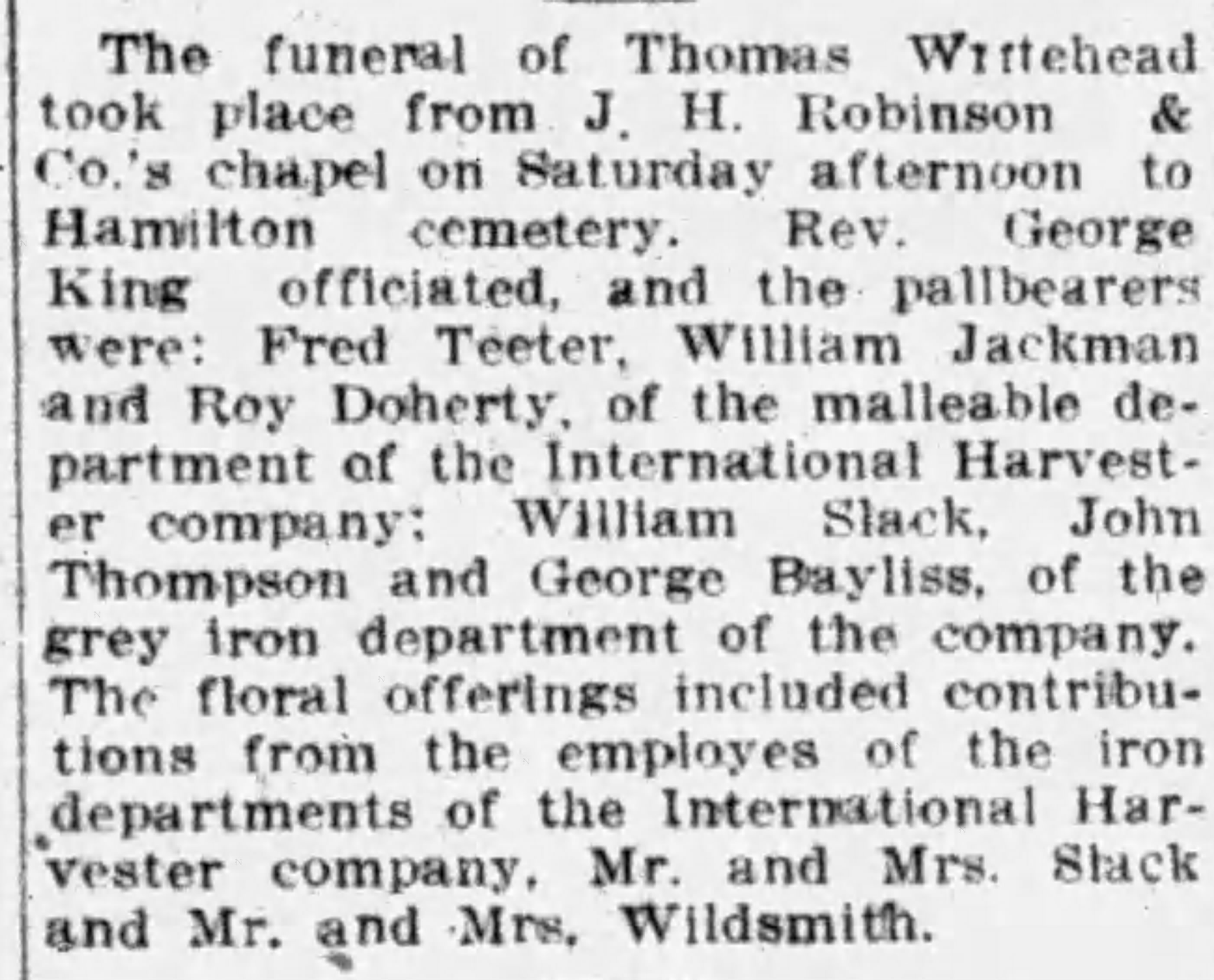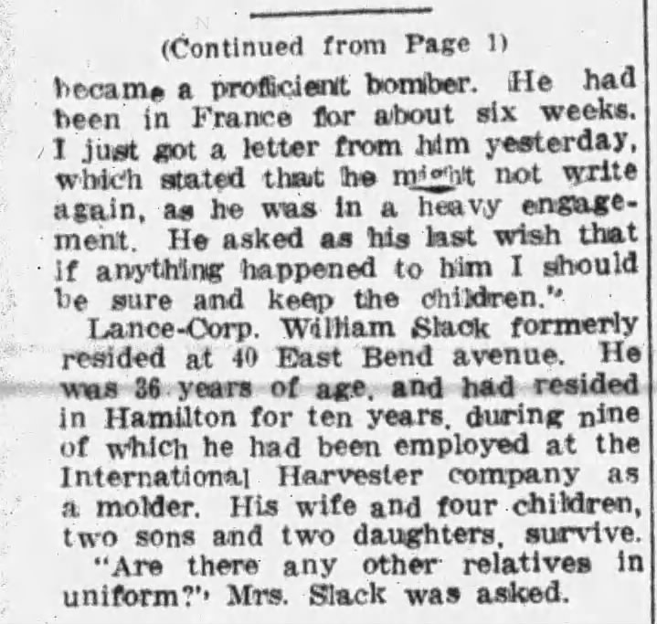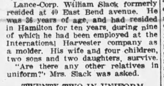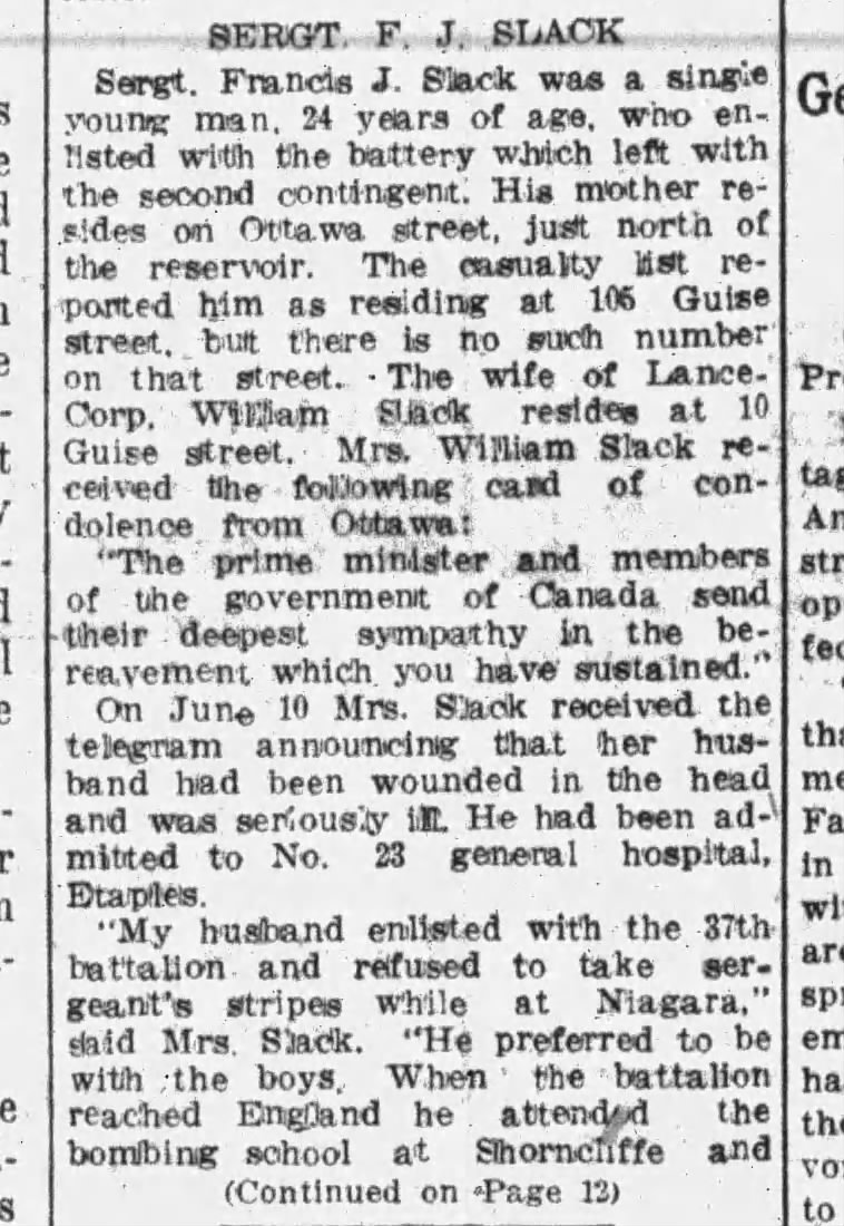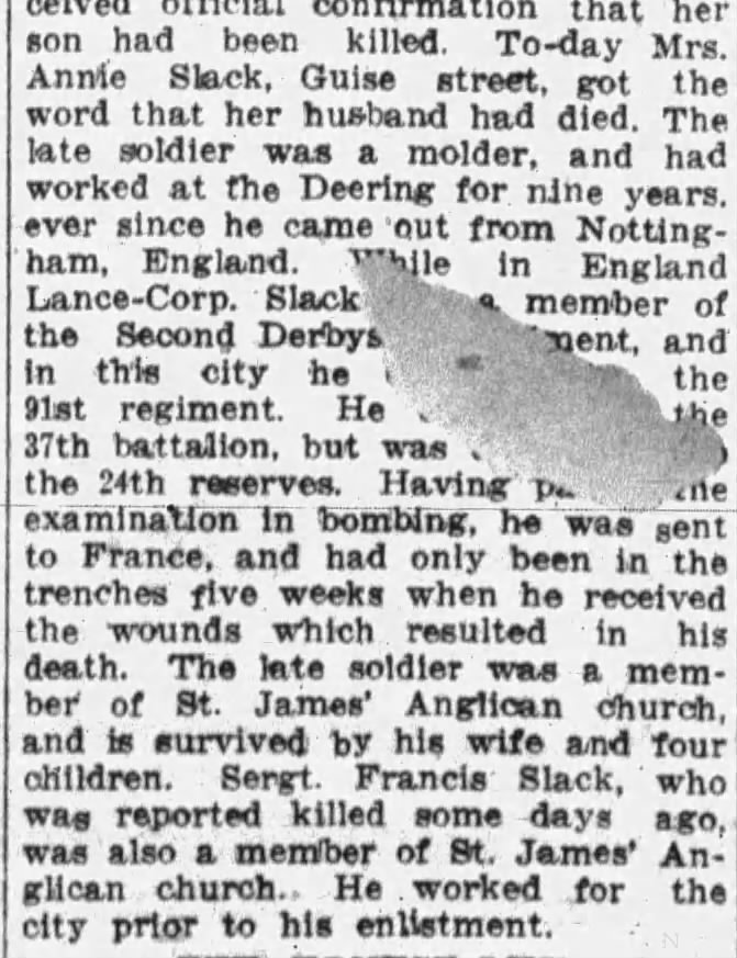 Family Search: When Lance-Corporal William Slack was born on 15 March 1881, in Mansfield, Nottinghamshire, England, United Kingdom, his father, James Slack, was 36 and his mother, Jane Colley, was 35. He had at least 2 sons and 2 daughters with Annie Eliza Coleman. He immigrated to Canada in 1913 and lived in Ontario, Canada in 1911 and Hamilton, Hamilton-Wentworth, Ontario, Canada in 1915. He registered for military service in 1915. In 1915, at the age of 34, his occupation is listed as moulder, international harvester in Hamilton, Hamilton-Wentworth, Ontario, Canada. He died on 15 July 1916, in Étaples, Pas-de-Calais, France, at the age of 35, and was buried in Étaples, Pas-de-Calais, France.
