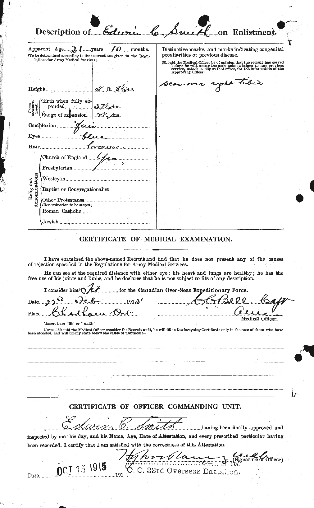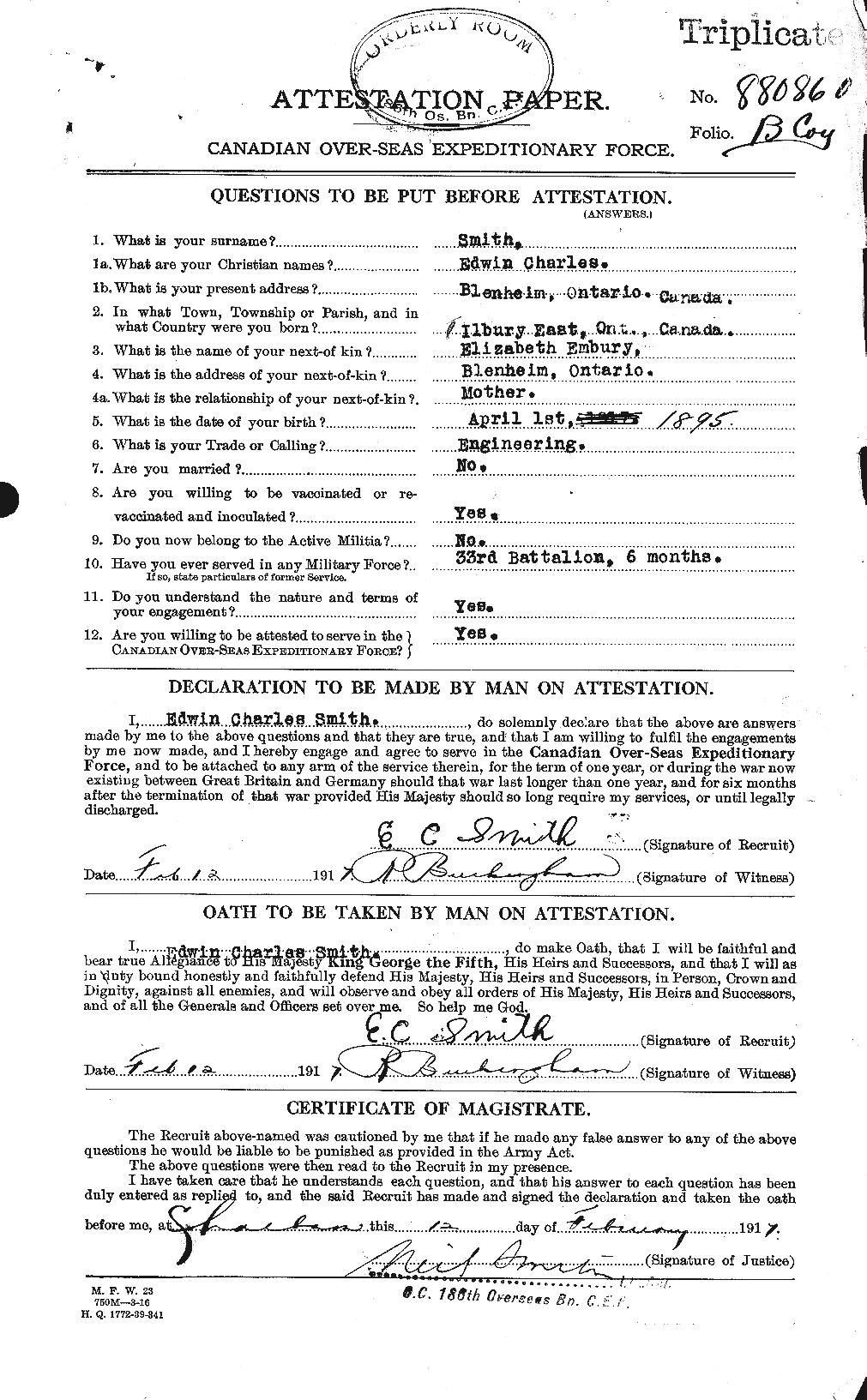 Edwin (Edward) Charles SMITH was born 1 April 1893 to Eliza-beth Caroline SMITH in Raleigh Township, Ontario. Elizabeth Car-oline SMITH was born 7 January 1877 in Tilbury East Township, Ontario, daughter of Charles SMITH and Jane YATES. Charles and Jane emigrated to Canada in 1875 according to the 1901 cen-sus. Jane’s death certificate lists her father as William YATES and her birth date as 14 April 1845. Elizabeth married William Henry EMBURY. Pte. E. C. SMITH was survived by his mother and his EMBURY siblings.