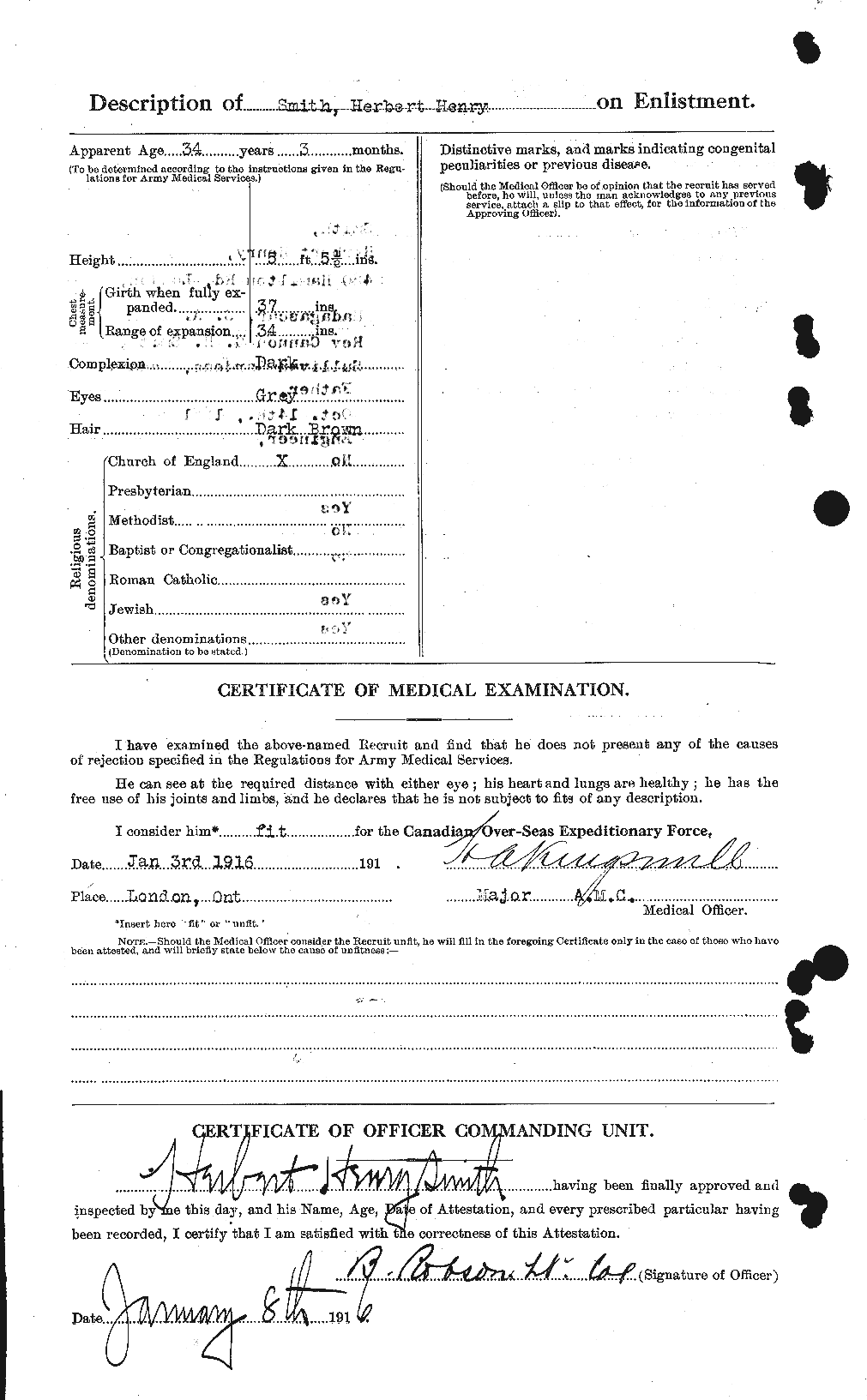 Family Search: Private Herbert Henry Smith was born on 14 October 1881, in Madagascar as the son of Canon G.H. Smith. He immigrated to Canada in 1915 and lived in London, Ontario, Canada in 1916. He registered for military service in 1916. In 1916, at the age of 35, his occupation is listed as engineer in London, Ontario, Canada. He died on 12 April 1917, in Thélus, Pas-de-Calais, Nord-Pas-de-Calais, France, at the age of 35.