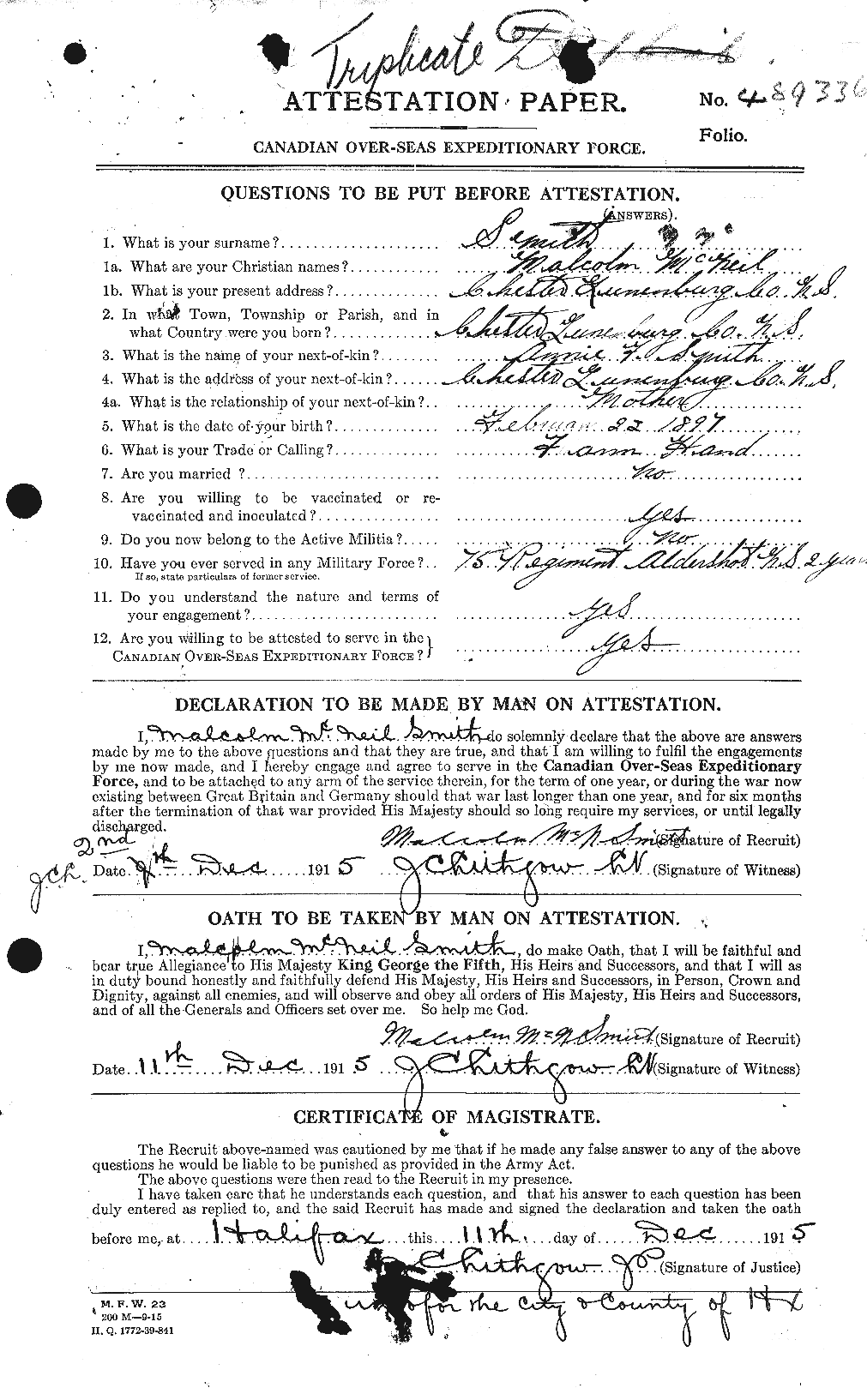 Family Search: When Private Malcolm MacNeil Smith was born on 22 February 1897, in Chester, Lunenburg, Nova Scotia, Canada, his father, Edward Curren Smith, was 43 and his mother, Annie Francis Crosskill, was 38. He registered for military service in 1915. In 1915, at the age of 18, his occupation is listed as farm hand. He died on 21 July 1916, in Ieper, West Flanders, Belgium, at the age of 19, and was buried in Ieper, West Flanders, Belgium.