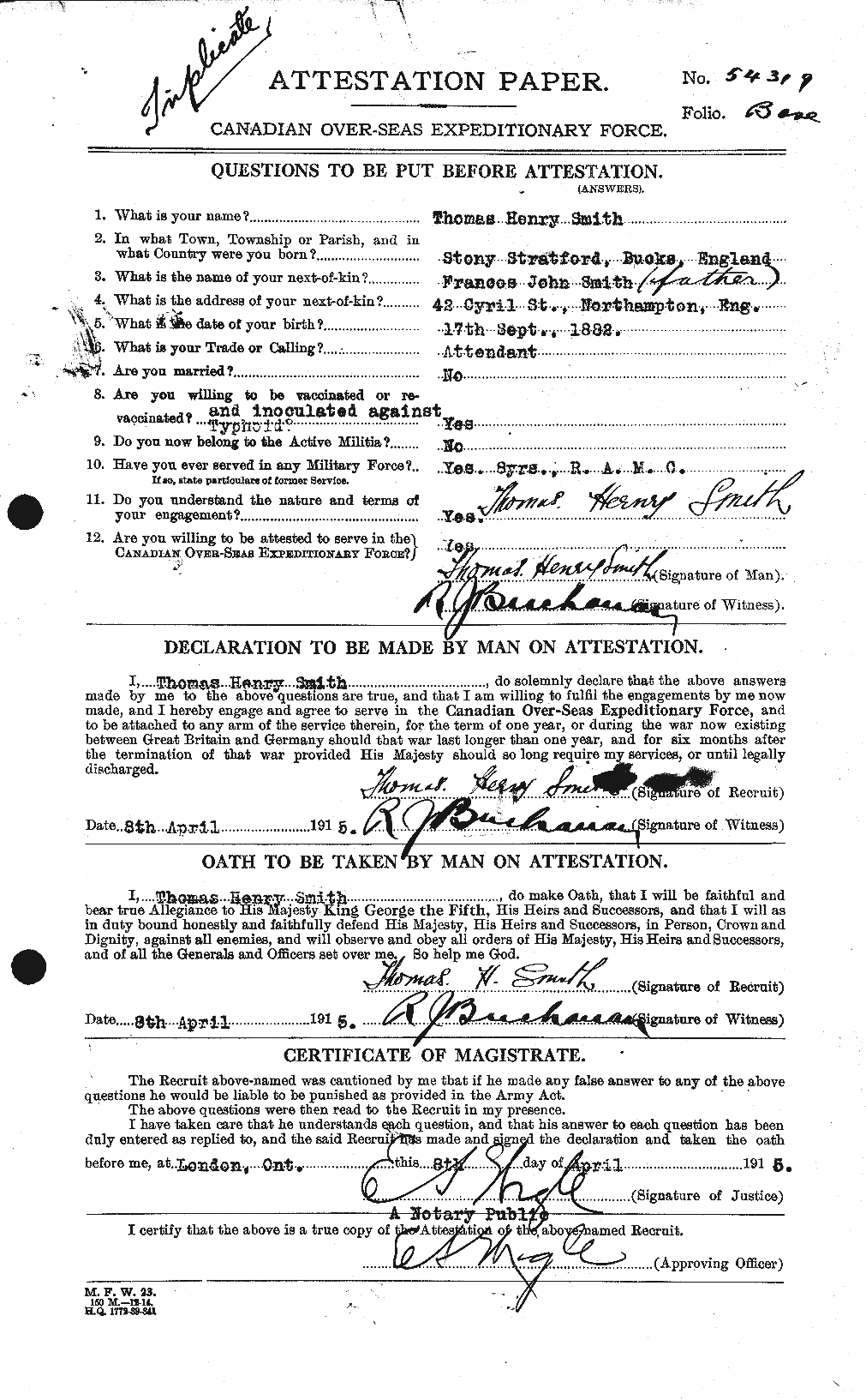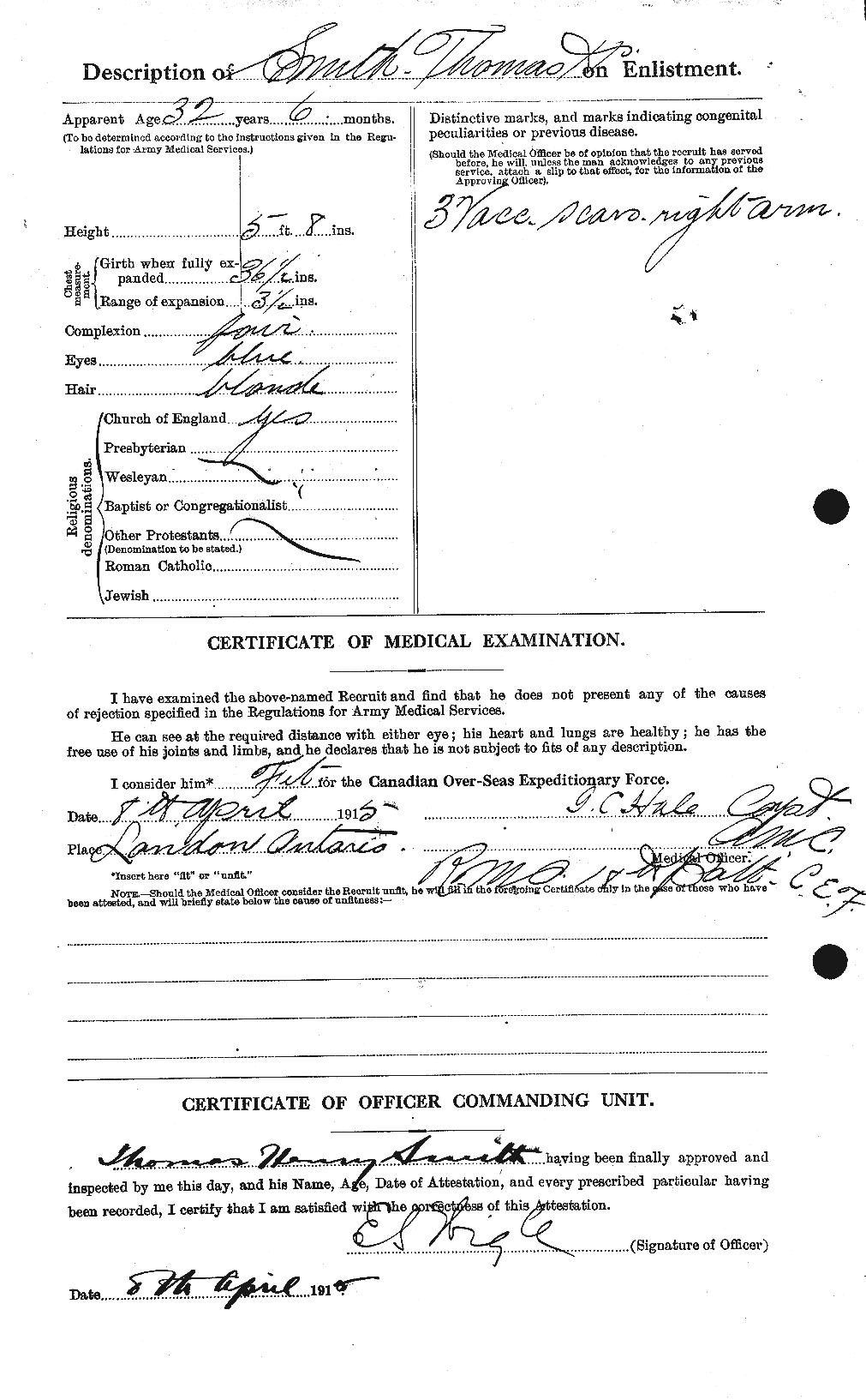 Family Search: Private Thomas Henry Smith was born on 17 September 1882, in Stony Stratford, Buckinghamshire, England, United Kingdom as the son of Frances John Smith. He immigrated to Canada in 1914. He registered for military service in 1915. In 1915, at the age of 33, his occupation is listed as attendant in London, Ontario, Canada. He died on 11 April 1916, in Ieper, West Flanders, Belgium, at the age of 33, and was buried in Ieper, West Flanders, Belgium.