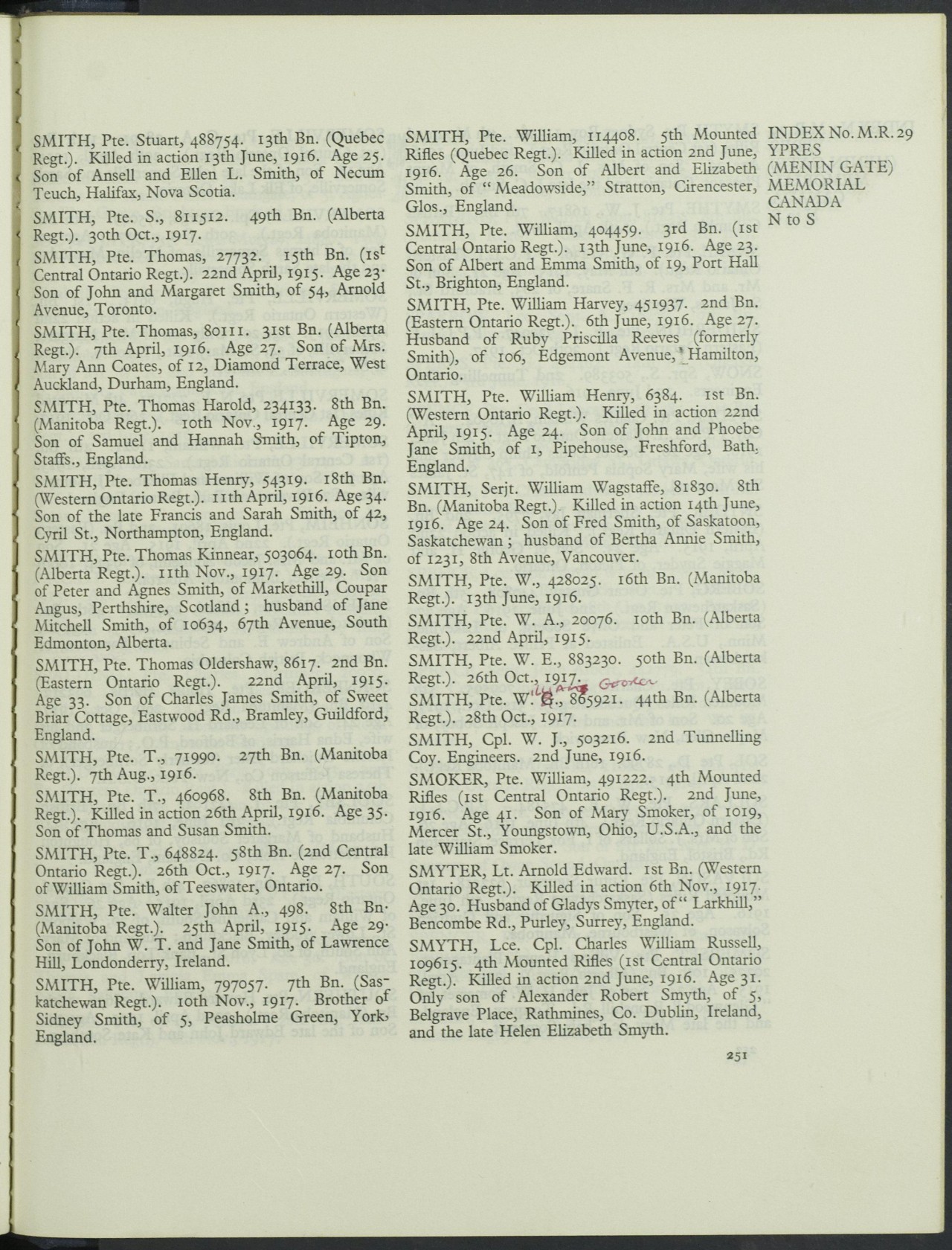 Three London men killed and nine wounded is the official casualty report of last night and this morning from Ottawa. In addition there are many others in the list from Western Ontario. No less than three of Windsor’s sons are mentioned killed in action. Pte. Thos. Henry Smith, of London, is missing.