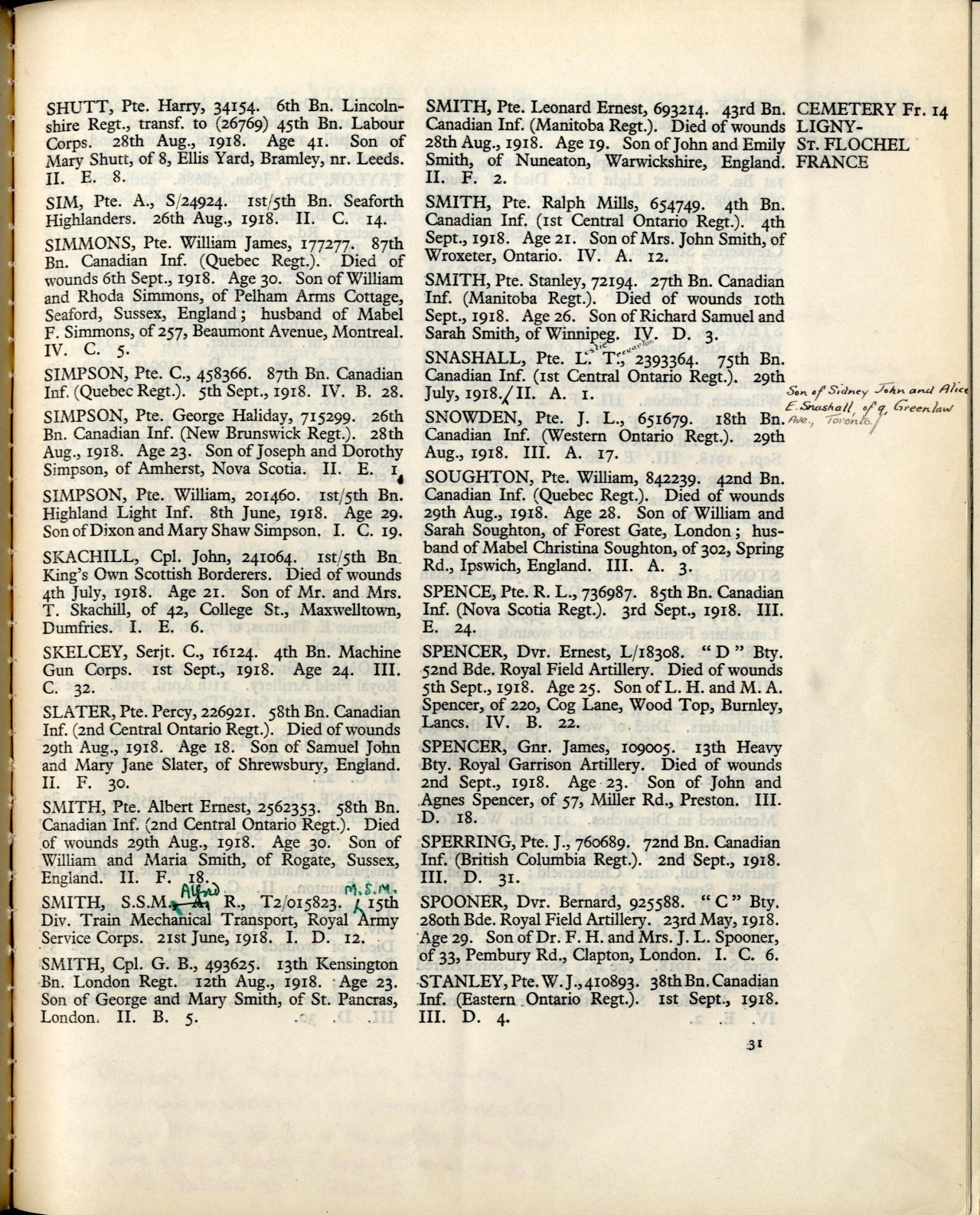 PRIVATE SNOWDON, born in Huron Township, Ontario. May 9, 1897. Home in Kincardine, Ontario. Joined Kincardine branch, August 4, 1913. Enlisted from Kincardine branch, February 28, 1916, in the 160th Battalion. Afterwards transferred to the 18th Battalion. Present at Amiens and Arras. Killed in action at Arras, August 28, 1918.