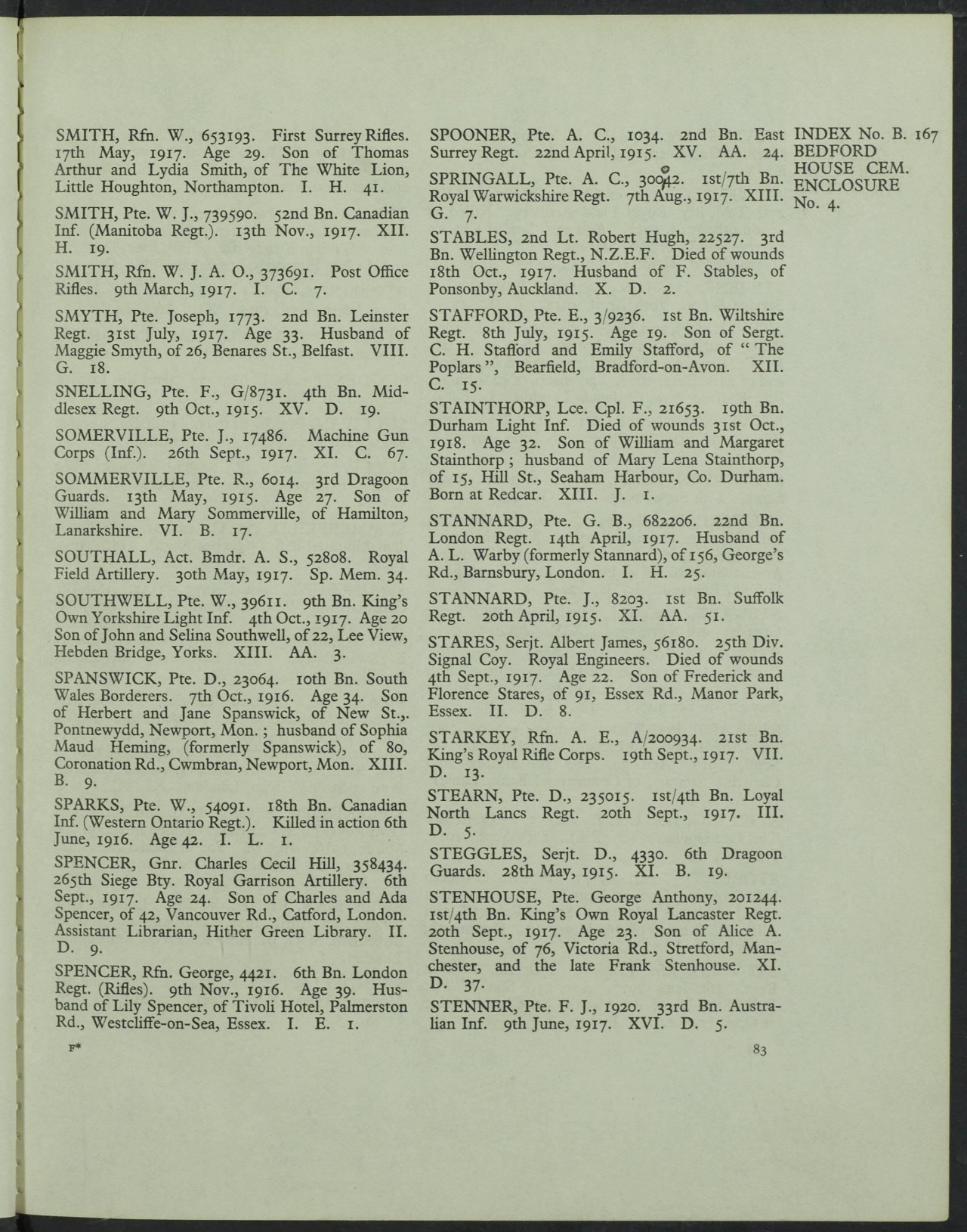 Family Search: Private William Sparks was born on 14 April 1874, in City of London, England, United Kingdom as the son of Sarah. He immigrated to Canada in 1914. He registered for military service in 1914. In 1914, at the age of 40, his occupation is listed as labourer. He died on 6 June 1916, in Ieper, West Flanders, Belgium, at the age of 42, and was buried in Zillebeke, Ieper, West Flanders, Belgium.
