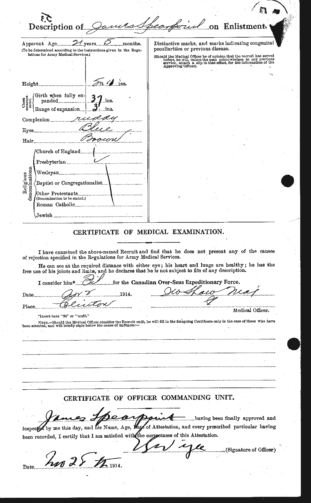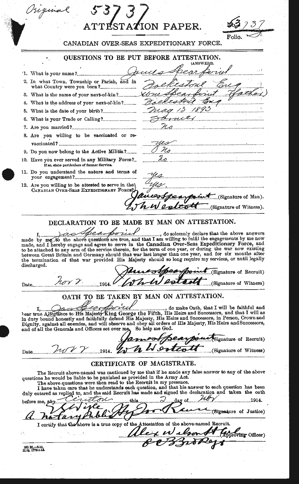 Notes: Nelson Westcott, Percy Rolph, and Joseph Harold Klein survived the war. Private Klein lost an arm. Private Spearpoint was killed in action on August 29, 1918. He died serving with the 8th Battalion.