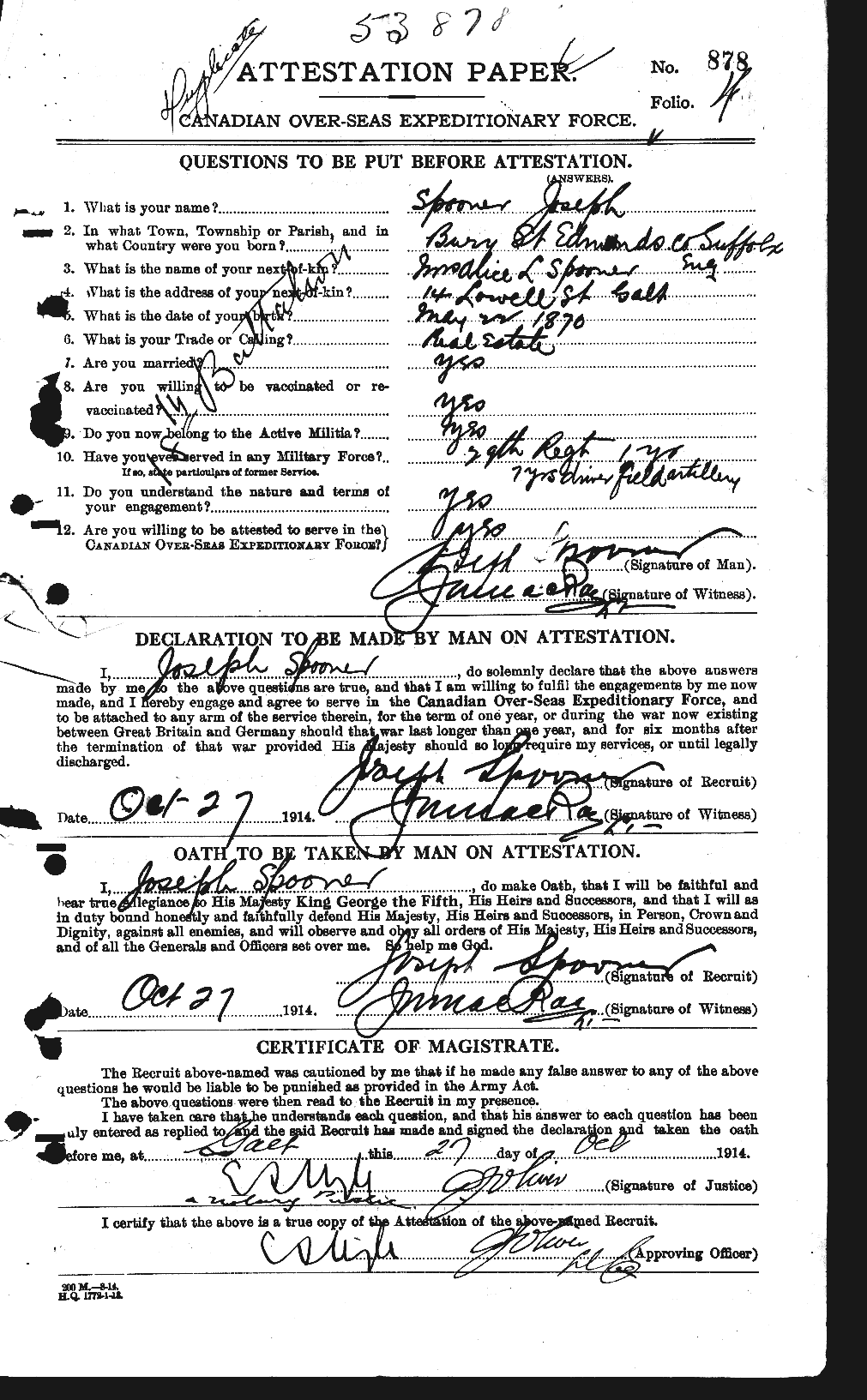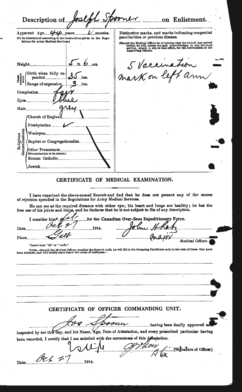 Lance Serjeant Joseph Spooner was killed in action at Dickie Bush Belgium during WW1, Canadian Infantry (Western Ontario Regiment) 18th Battalion. Former service 29th Regiment one year, 7 years as a field artillery driver. Enlisted on the 27 Oct. 1914 the Attestation Paper indicates he gave a birth date of 22 May 1870 making him 44 years old. His entry of birth shows a date of 1867 and 47 years old. It would seem he used the 1870 date of birth to appear younger. At 47 years old he’s possibly too old to serve.