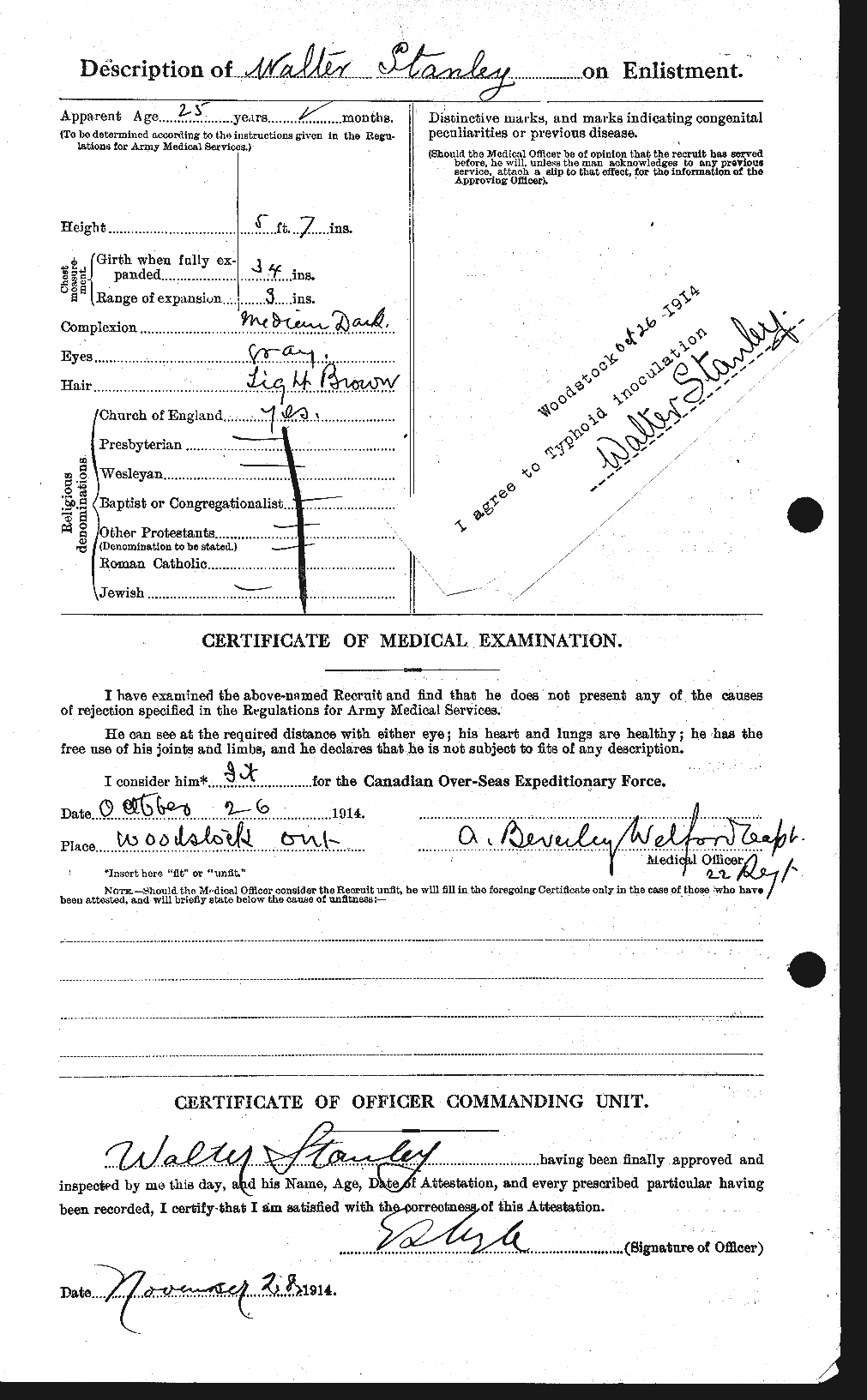 Interesting notation on 3rd page of attestation paper. It reads: In the event of my becoming a casualty notify: Mrs. Emma Coffin, General Delivery, Renton Washington, U.S.A. The soldier Tom Stanley’s reg. no. is 2204971.