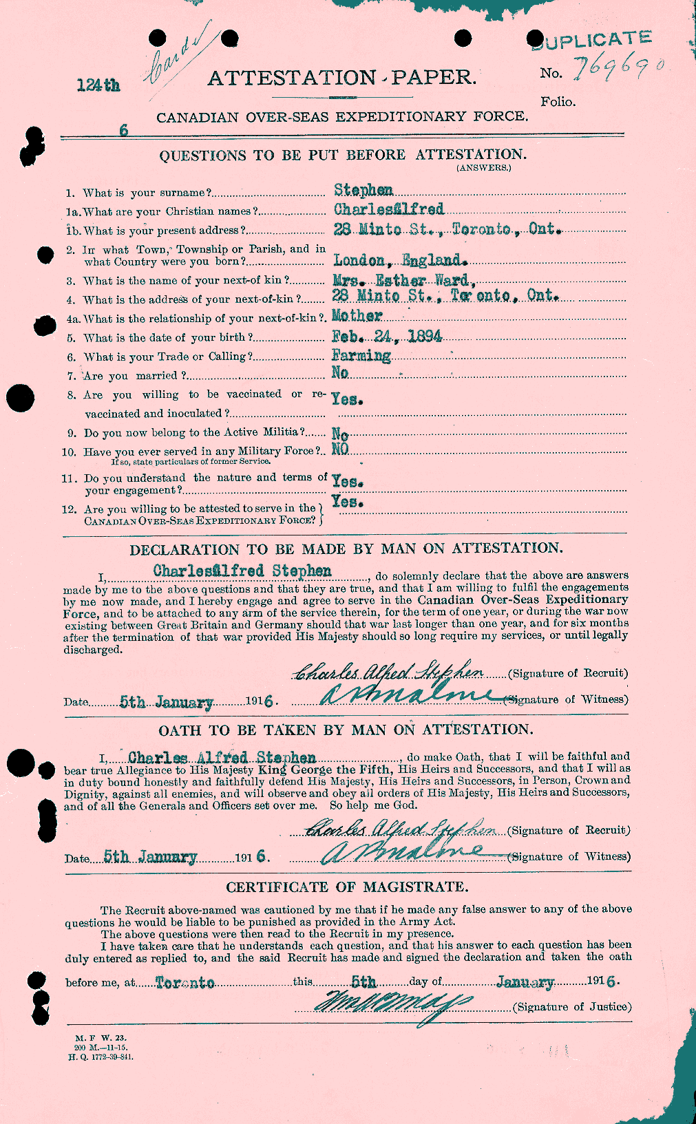 First to enlist from Minto street, and first to be killed was Private Chas. Alfred Stephen. He fell at Vimy Ridge April 9, aged 22, after six months at the front. Before enlisting he was employed as a shipper for the Home Pattern Co. His bother, Edward R.A. Stephens, is overseas in the 134th Battalion, and their stepfather, Pte. G.M. Ward, himself a veteran of the South African war, is there, too, in the 170th Battalion. They are of English birth, and have been in Canada for years, and formerly lived at 28 Munro street.
