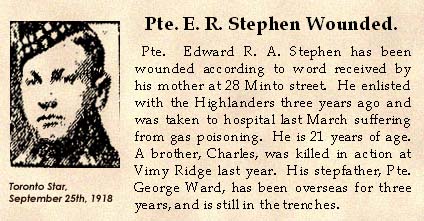 Pte. Edward R.A. Stephen [sic] has been wounded according to word received by his mother at 28 Minto street. He enlisted with the Highlanders three years ago and was taken to hospital last march suffering from gas poisoning. He is 21 years of age. A brother, Charles, was killed in action at Vimy Ridge last year. His stepfather, Pte. George Ward, has been overseas for three years, and is still in the trenches.