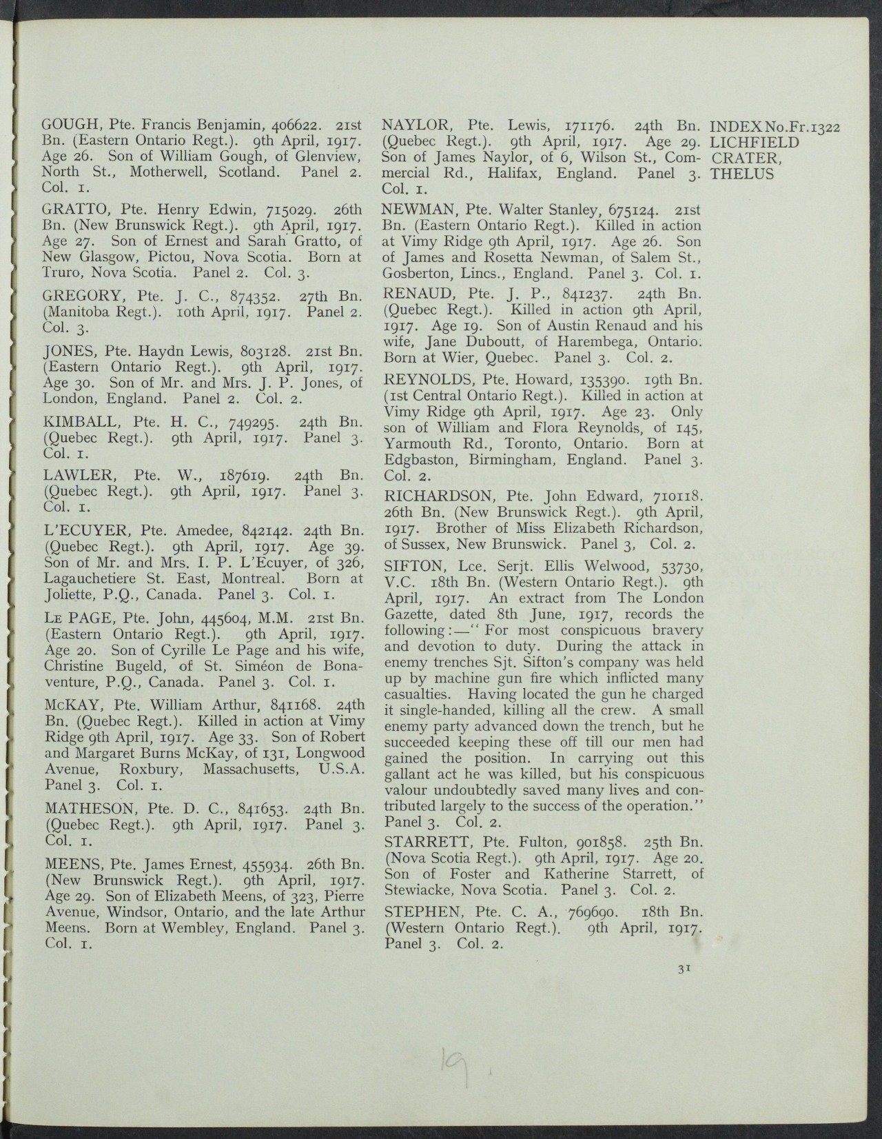 Family Search: When Private Charles Alfred Stephen was born on 24 February 1896, in Islington, London, England, United Kingdom, his father, Charles Alfred Stephen, was 23 and his mother, Esther Mary Ann Rockall, was 22. He immigrated to Toronto, York, Ontario, Canada in 1912 and lived in Toronto, York, Ontario, Canada in 1916. He registered for military service in 1916. In 1915, at the age of 21, his occupation is listed as shipper, home pattern company in Toronto, York, Ontario, Canada. He died on 9 April 1917, in Thélus, Pas-de-Calais, Nord-Pas-de-Calais, France, at the age of 21, and was buried in Thélus, Pas-de-Calais, Nord-Pas-de-Calais, France.