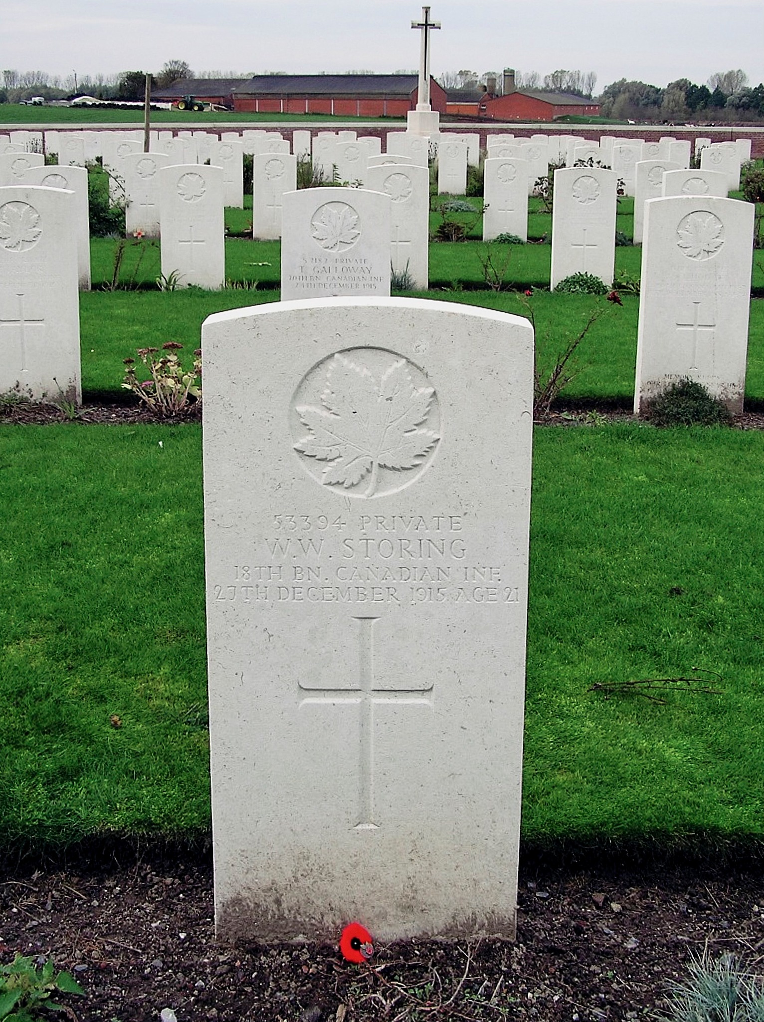 Family Search: When Private William Wesley Storing was born on 6 September 1894, in Renfrew, Ontario, Canada, his father, James Edward Storing, was 35 and his mother, Rosabella McCharles, was 26. He lived in Kent, Ontario, Canada in 1911. He registered for military service in 1914. In 1914, at the age of 20, his occupation is listed as labourer. He died on 27 December 1915, in Ieper, West Flanders, Belgium, at the age of 21, and was buried in Voormezele, Ieper, West Flanders, Belgium.