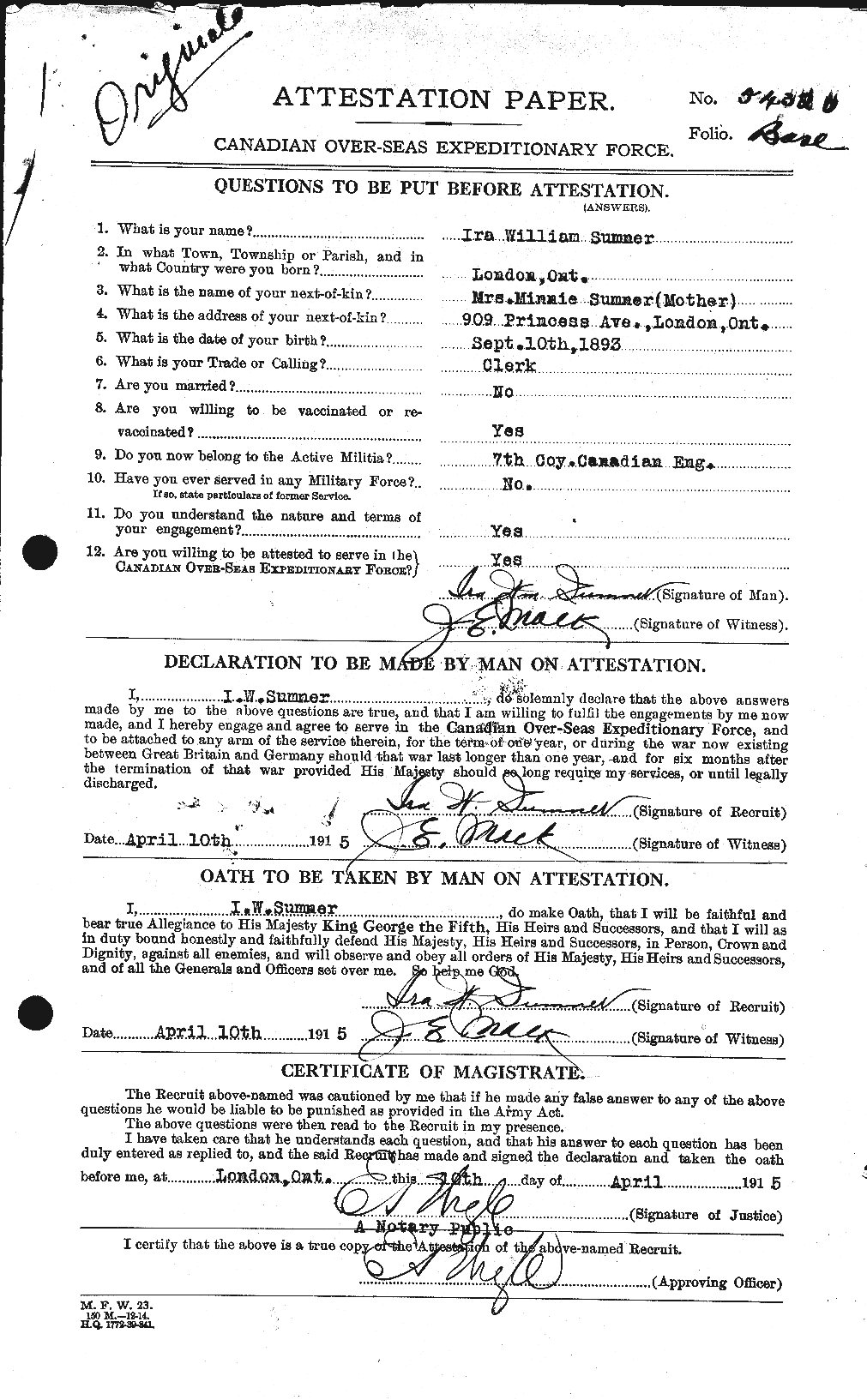 Enlisted Apr 10, 1915, in London, Ont.