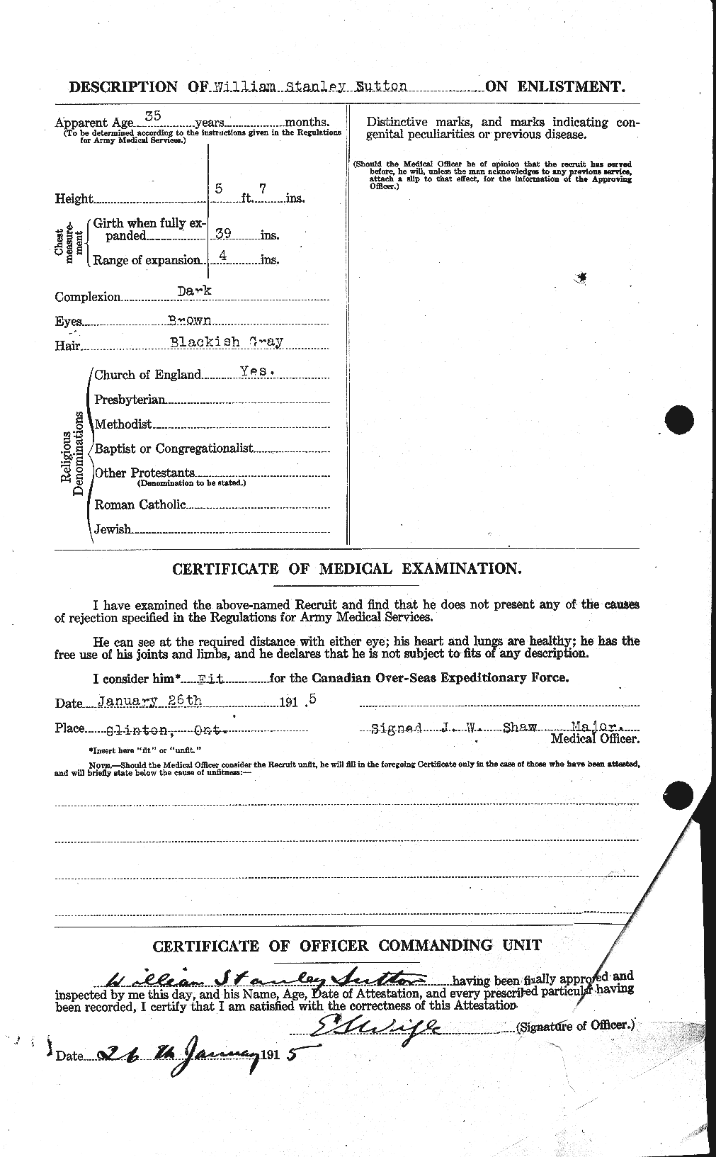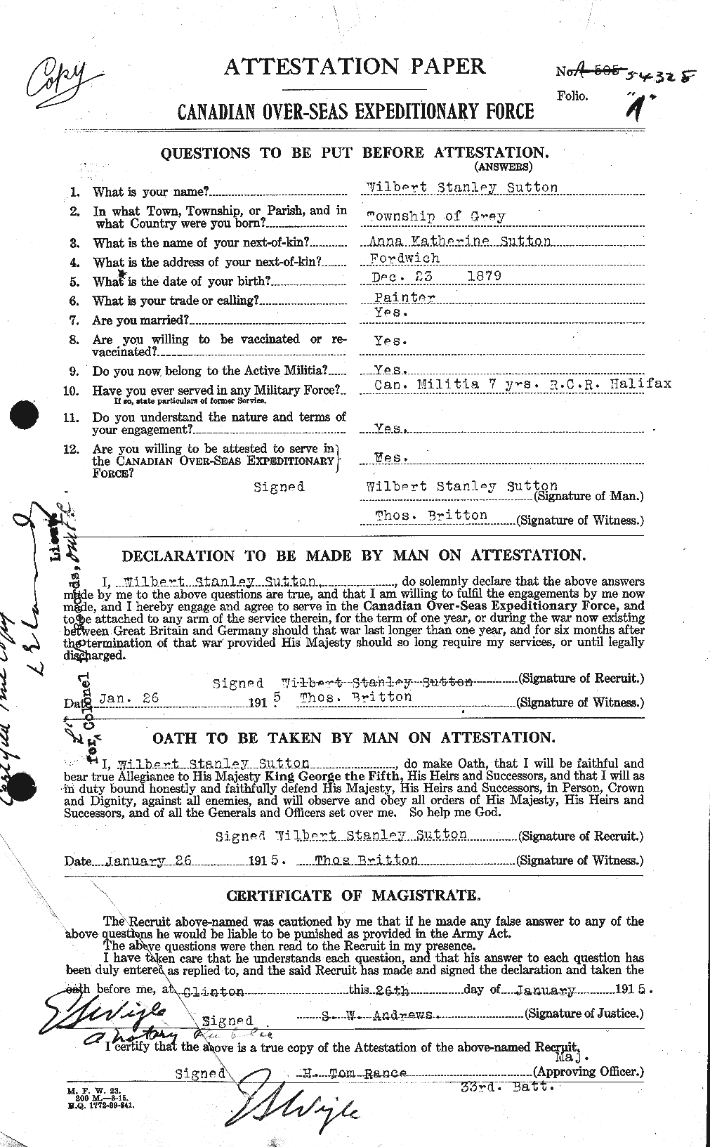 Family Search: When Private Wilbert Stanley Sutton was born on 23 December 1879, in St. Vincent, Grey, Ontario, Canada, his father, James Sutton, was 32 and his mother, Mary Jane Free, was 24. He married Anna Catherine Plauntz on 30 December 1908, in Huron, Ontario, Canada. They were the parents of at least 3 sons. He lived in Grey, Ontario, Canada in 1901 and Fordwich, Huron, Ontario, Canada in 1915. He registered for military service in 1915. In 1915, at the age of 36, his occupation is listed as printer in Fordwich, Huron, Ontario, Canada. He died on 15 September 1916, in Courcelette, Somme, Picardie, France, at the age of 36.