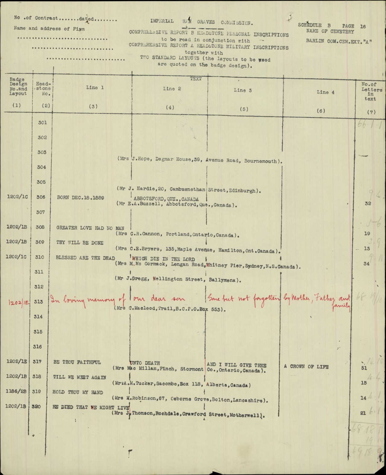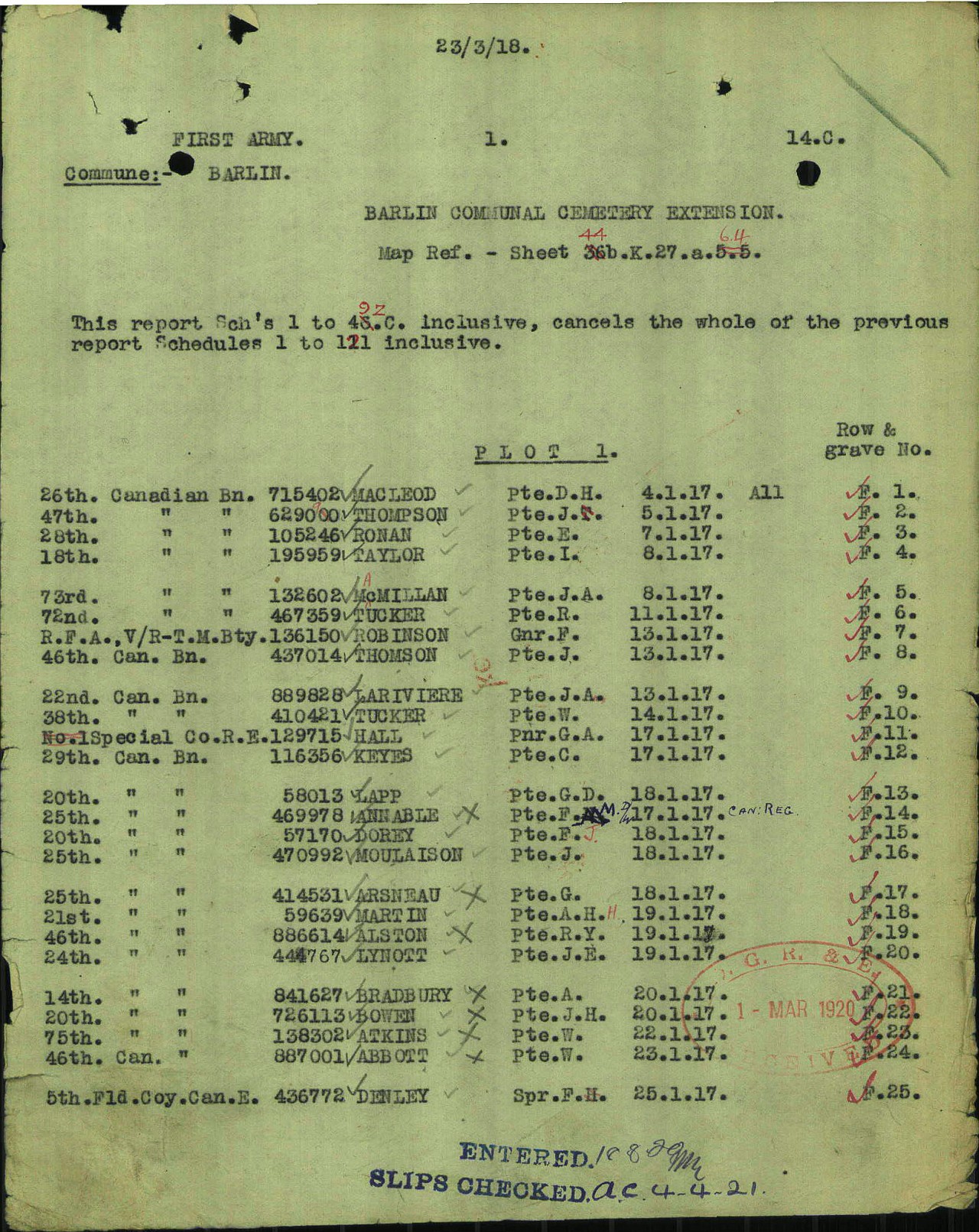 Family Search: When Private Isaac Taylor was born on 23 February 1884, in Curve Lake, Curve Lake First Nation 35, Peterborough, Ontario, Canada, his father, William Isaac Taylor Jr., was 18 and his mother, Mary Jane Yellowhead, was 13. He married Ella Devaney on 20 June 1907, in Ontario, Ontario, Canada. He lived in Peterborough, Ontario, Canada in 1901 and Scugog Island, Ontario, Canada in 1916. He registered for military service in 1916. In 1916, at the age of 32, his occupation is listed as farmer in Scugog Island, Ontario, Canada. He died on 8 January 1917, in Barlin, Pas-de-Calais, France, at the age of 32, and was buried in Barlin Communal Cemetery Extension, Barlin, Pas-de-Calais, France.