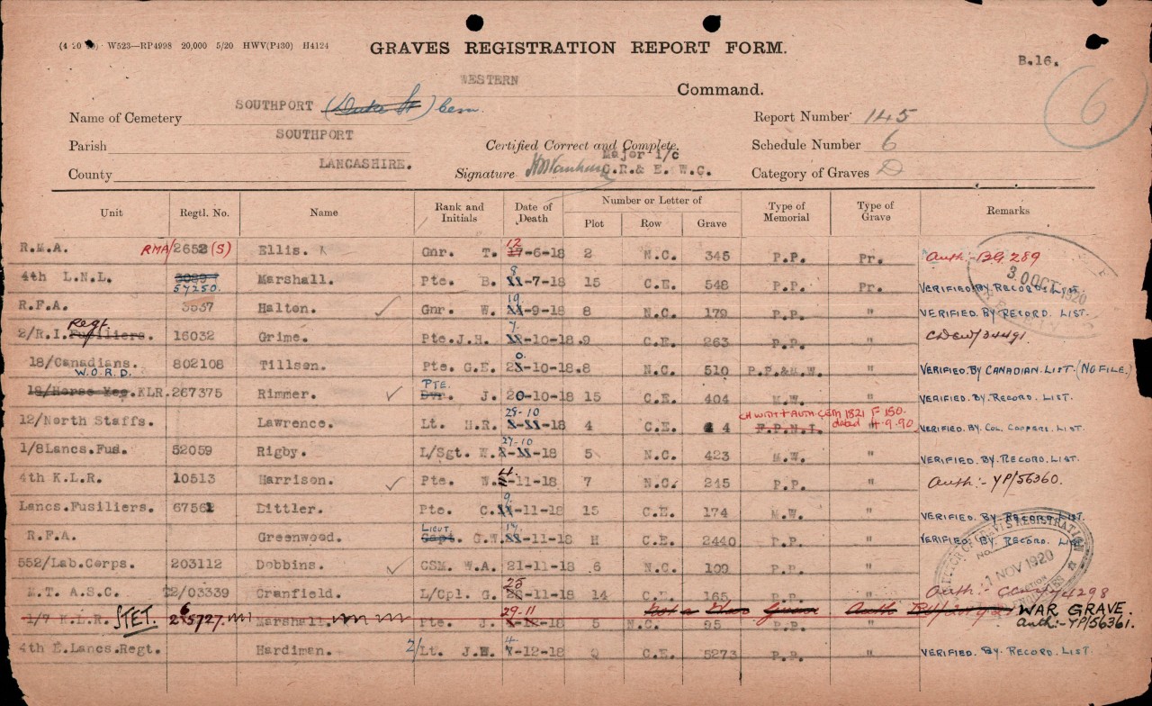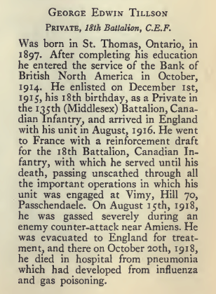 Family Search: When Private George Edwin Tillson was born on 1 December 1897, in St. Thomas, Elgin, Ontario, Canada, his father, Lewis Edwin Tillson, was 36 and his mother, Marian Ferguson, was 36. He lived in Kent, Ontario, Canada in 1901 and London, Ontario, Canada in 1915. He registered for military service in 1915. In 1915, at the age of 18, his occupation is listed as bank clerk in London, Ontario, Canada. He died on 20 October 1918, in Southport, Merseyside, England, United Kingdom, at the age of 20, and was buried in Duke Street Cemetery, Southport, Merseyside, England, United Kingdom.