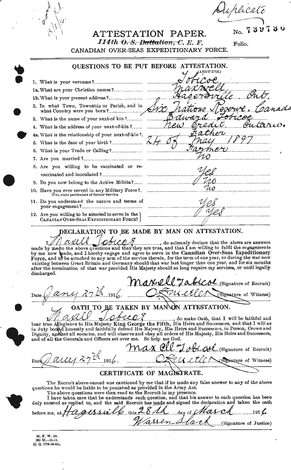 Family Search: When Private Maxwell Tobicoe was born on 24 May 1897, in Six Nations 40, Six Nations, Ontario, Canada, his father, Edward Smith Tobicoe, was 33 and his mother, Susannah Bessie King, was 30. He lived in Hagersville, Haldimand, Ontario, Canada in 1916. He registered for military service in 1916. In 1916, at the age of 19, his occupation is listed as farmer in Hagersville, Haldimand, Ontario, Canada. He died on 9 November 1917, in Passendale, West Flanders, Belgium, at the age of 20, and was buried in Ieper, West Flanders, Belgium.