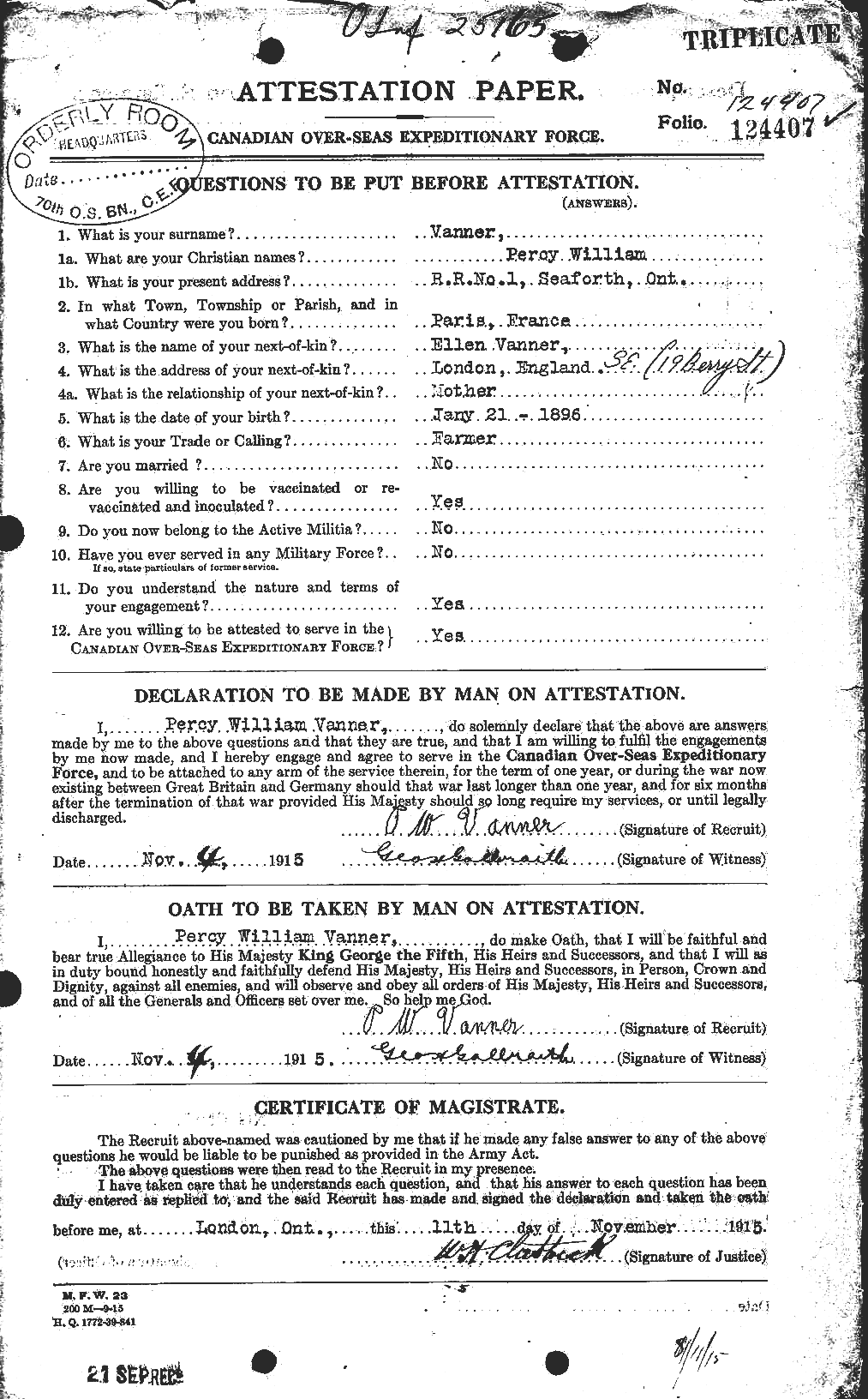 He transferred to 39th Battalion at West Sandling on July 6, 1916. He was then drafted to reinforce the 18th Battalion and went overseas into France, to the Canadian Base Depot on August 18, 1916.