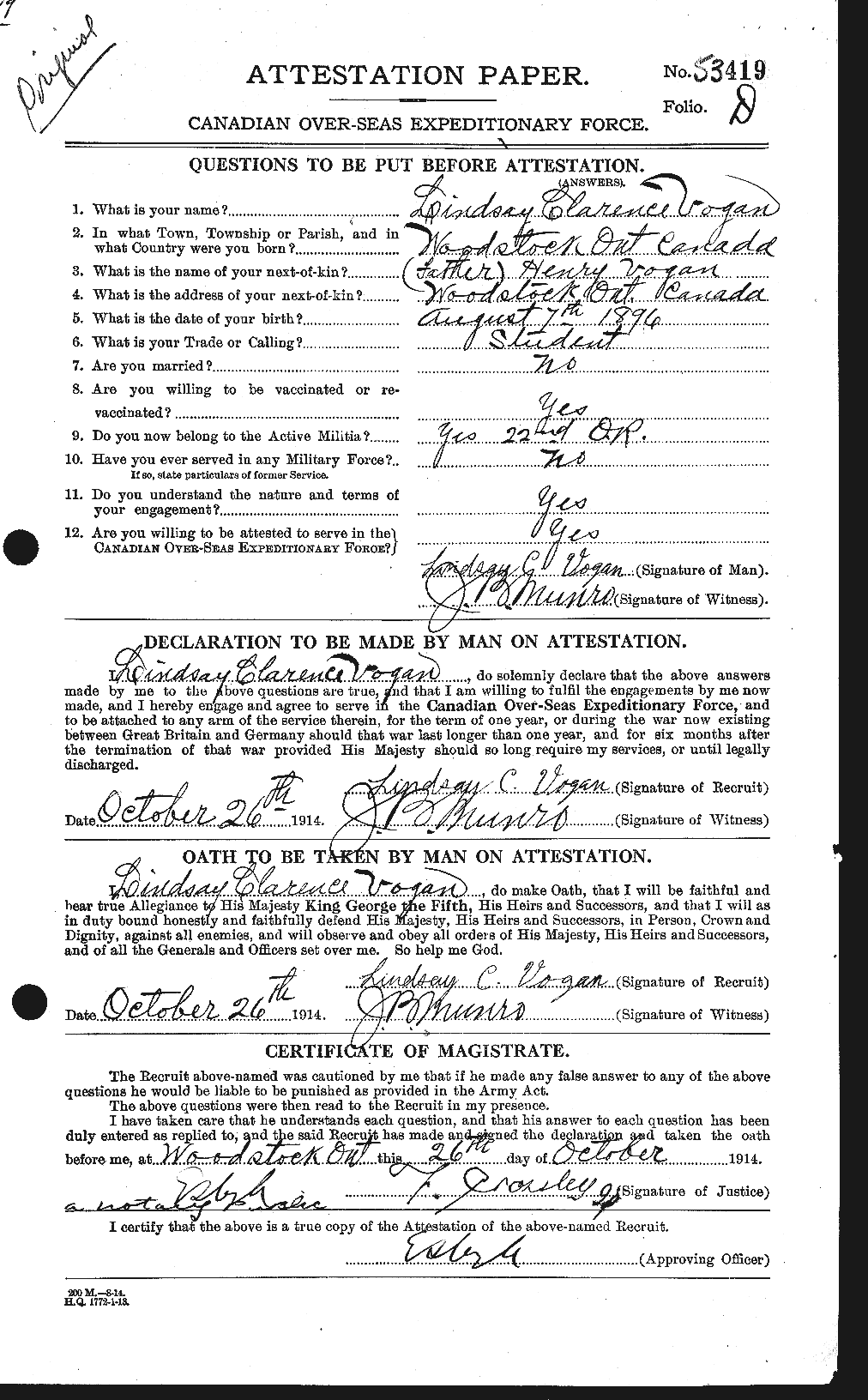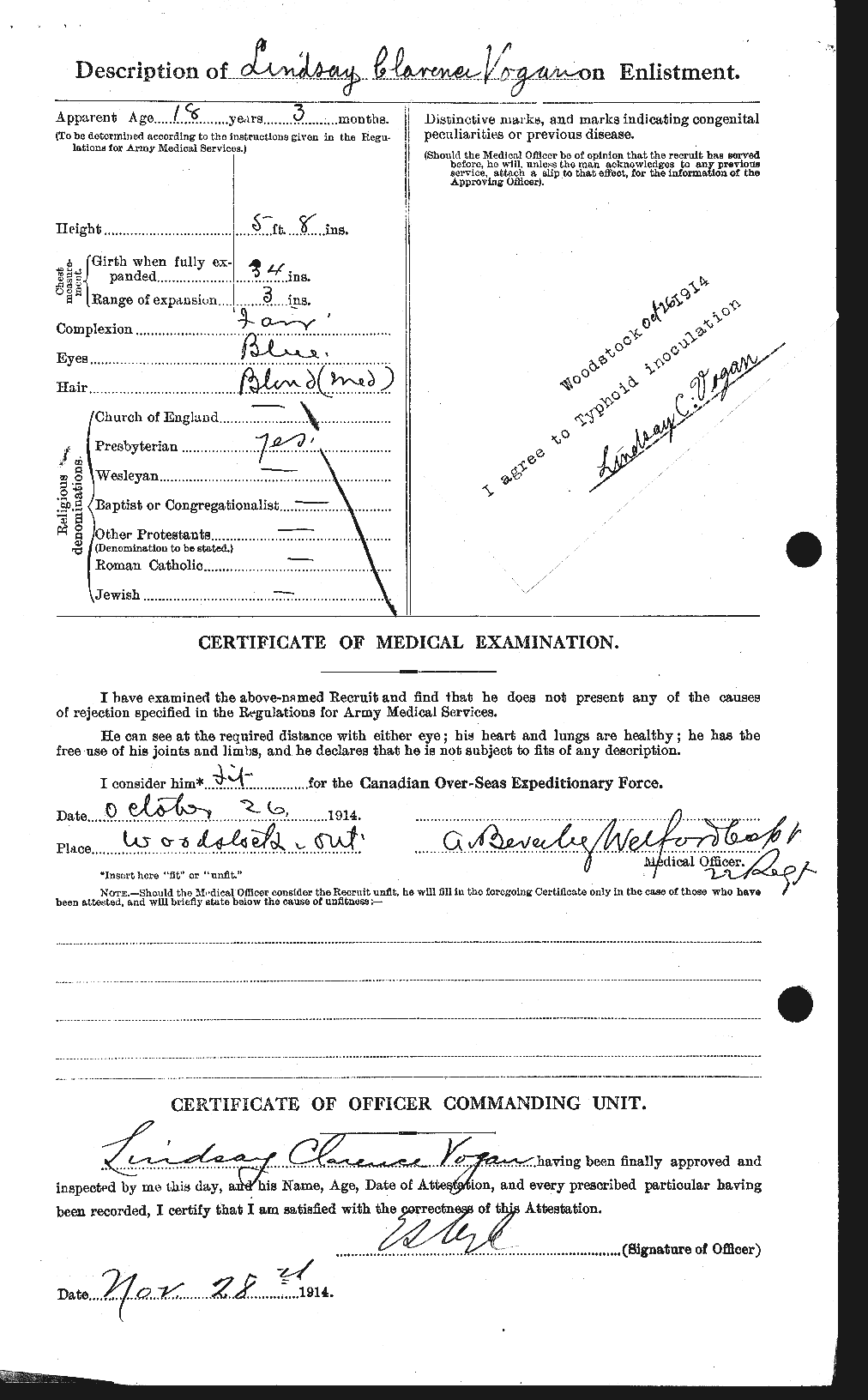 Lieut. Lindsay Vogan was a very popular young man. At the time of his enlistment he was attending the Collegiate Institute. He enlisted in the 18th Battalion and carried the title of sergeant, which he had acquired in the old 22nd Oxford Rifles. He was known in the overseas unit as the “baby sergeant,” on account of his youth, not having yet attained his eighteenth year when he enlisted. He was a sergeant in Capt. Woodroofe’s company in the 22nd Regiment, “and one of the best in the regiment,” stated Capt. Woodroofe this morning on being appraised of his death. After going overseas he was transferred to the 13th Imperial Middlesex Regiment. He added to his career as a soldier by being advanced to the rank of lieutenant in the British unit. Lindsay Vogan had a host of friends in Woodstock, who will learn of deep regret of his death. Lieut. L. Vogan was insured at the time of his enlistment by the Oxford Patriotic Association, for $500 in the Imperial Life.