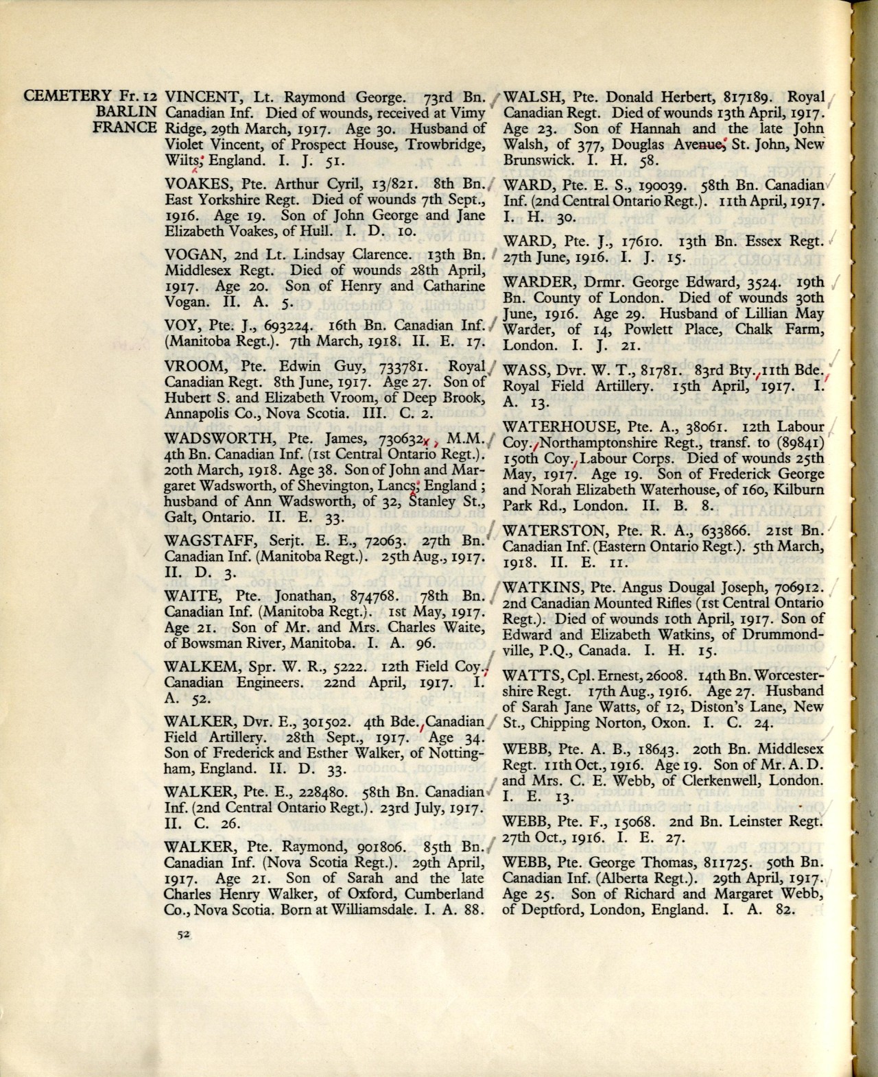 Family Search: When Second Lieutenant Lindsay Clarence Vogan was born on 7 August 1896, in Woodstock, Oxford, Ontario, Canada, his father, Henry Vogan, was 39 and his mother, Catharine Forrest, was 28. He lived in Oxford, Ontario, Canada for about 10 years. He registered for military service in 1914. In 1914, at the age of 18, his occupation is listed as student in Woodstock, Oxford, Ontario, Canada. He died on 28 April 1917, in Pas-de-Calais, France, at the age of 20, and was buried in Barlin, Pas-de-Calais, France.