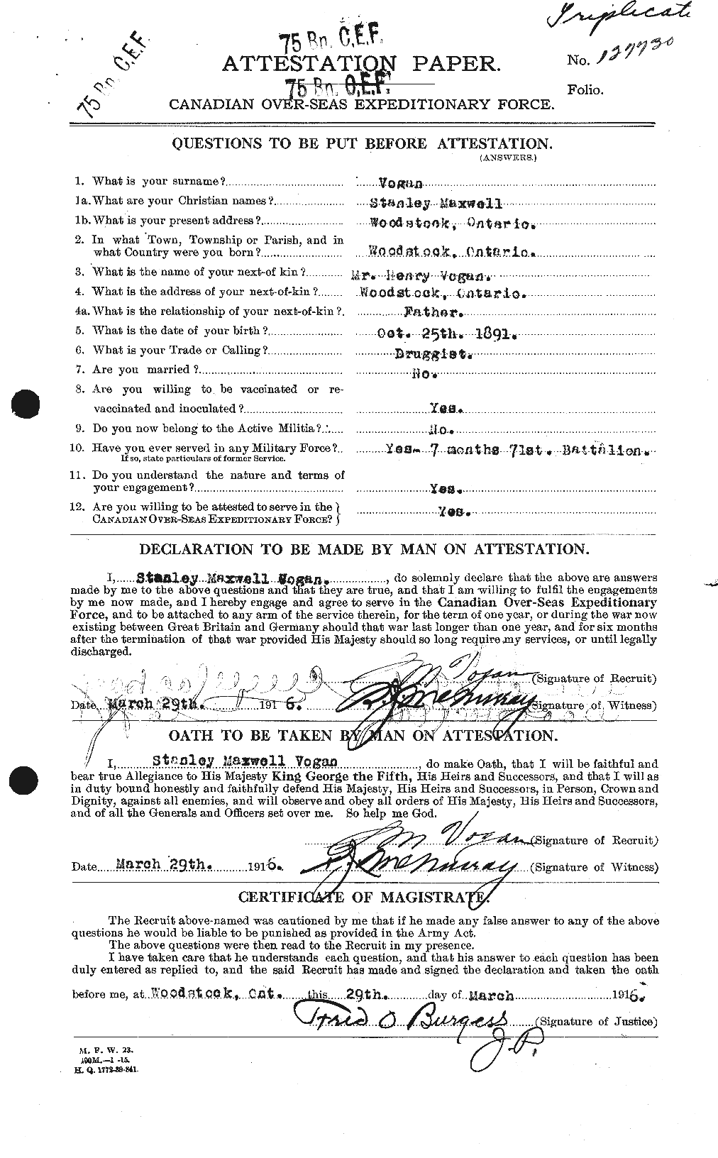 Son of the late Henry Vogan; b. Woodstock; ed. Woodstock P.S. and C.I.; College of Pharmacy, PHM.B. 1914; Druggist at Woodstock; 22nd Regt., Lieut.