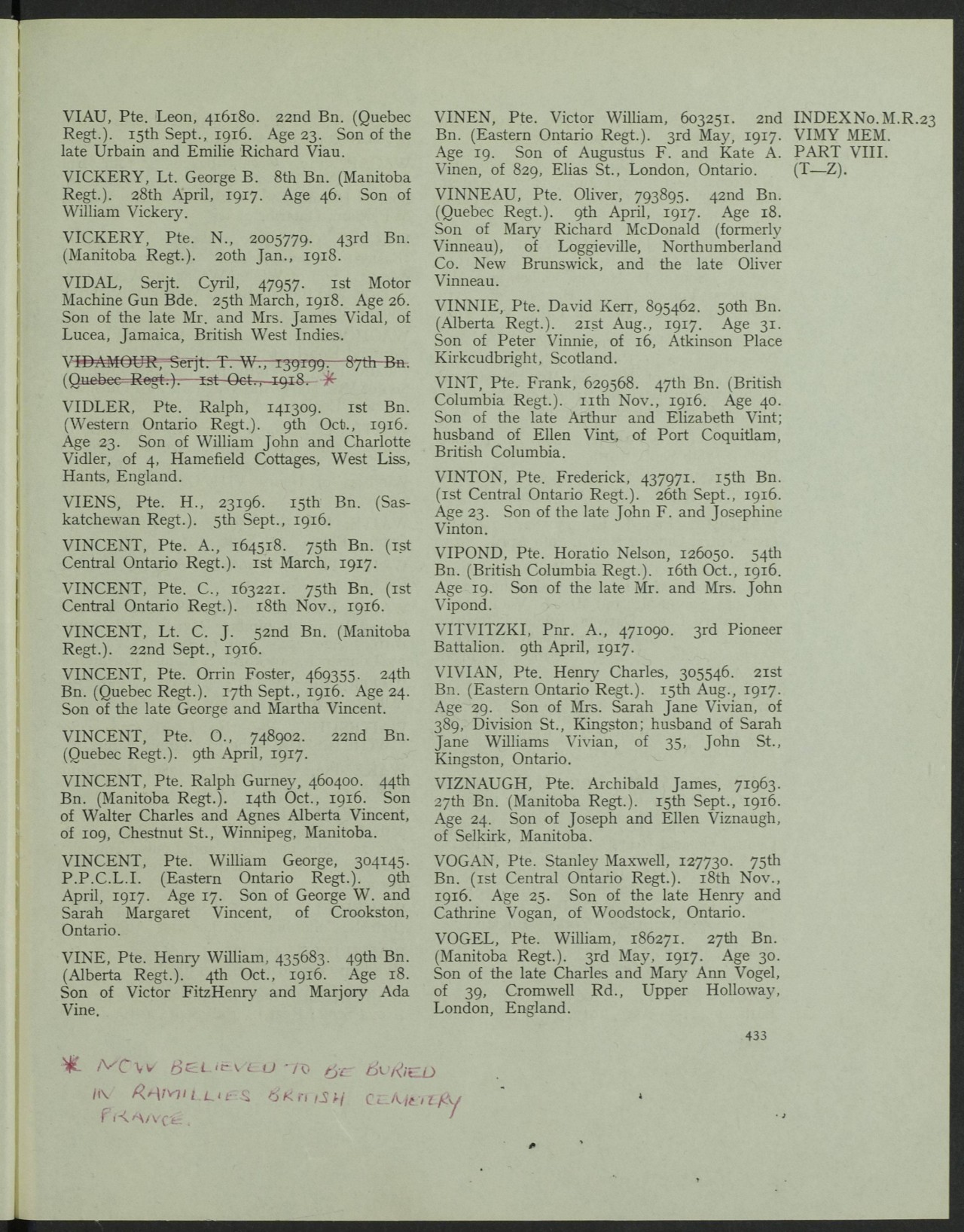 This record exists as the research of the the death of L.C. Vogan (brother) found this soldier and it was thought fitting to include Private S.M. Vogan as a means of honouring his brother.