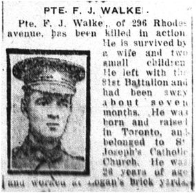 Pte. Frank J. Walke, reported killed in action to-day, was reported suffering from shell-shock in a cable received by his wife and two children living at 296 Rhodes ave., on Saturday last. In his last letter he stated he was returning to the trenches and hoped he would have continued good luck. Walke had been 7 months in the trenches with a draft of the 81st Battalion when he received the shell-shock which may have been the cause of his death. Walke was 27 years of age, born in Toronto, and was employed at Logan’s Brick Co. prior to enlisting.