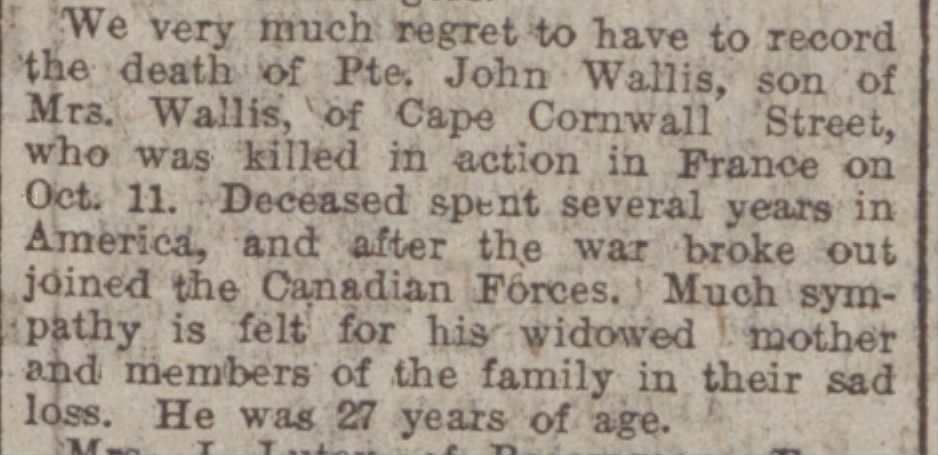Family Search: When Private John Wallis was born on 12 December 1889, in St Just in Penwith, Cornwall, England, United Kingdom, his father, Philip Harvey Wallis, was 35 and his mother, Annie Williams Uren, was 20. He immigrated to United States in 1913 and lived in Flint, Genesee, Michigan, United States in 1917. He registered for military service in 1917. In 1917, at the age of 28, his occupation is listed as miner in Flint, Genesee, Michigan, United States. He died on 11 October 1918, in Iwuy, Nord, France, at the age of 28.