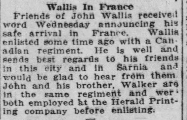 By 1917, he was living in Flint, Michigan and listed his occupation as a miner. In July of that year, he made his way to Windsor and enlisted in the Canadian army. Following summer training, Pte Wallis left Canada in December 1917 and his ship arrived on New Year’s Eve in Glasgow.