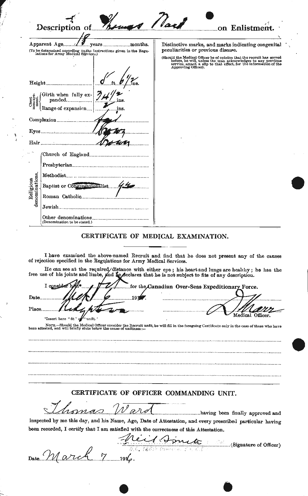 This soldier, reg. no. 880417, enlisted at Chatham, Ontario on March 6, 1916, with the 186th Overseas Battalion. His trade was as a farmer, and he was 18-years old at the time of his attestation according to his attestation papers. However, he was born in 1900, and was thus, under aged for enlistment with the CEF. He listed his brother, John, of London, England, as his next-of-kin.