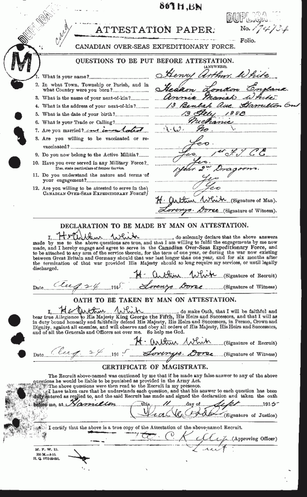 Family Search: Private Henry Arthur White was born on 13 July 1888, in Hendon St Alphage, London, England, United Kingdom as the son of Henry John White and Annie Maria Bodie. He immigrated to Canada in 1913 and lived in Hamilton, Wentworth, Ontario, Canada in 1915. He registered for military service in 1915. In 1915, at the age of 27, his occupation is listed as mechanic in Hamilton, Wentworth, Ontario, Canada. He died on 27 April 1918, in Orpington, London, England, United Kingdom, at the age of 29, and was buried in Orpington, London, England, United Kingdom.
